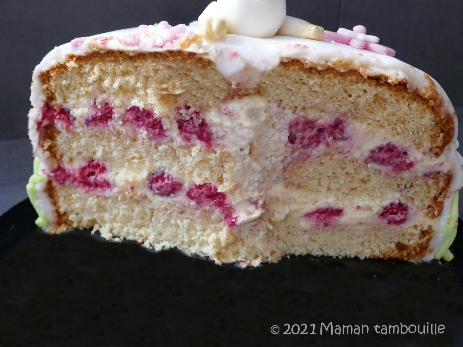 J’ai choisi de le couvrir de pâte à sucre mais on peut aussi le laisser tel quel et faire une déco juste sur le dessus avec des framboises fraîches ou autres …