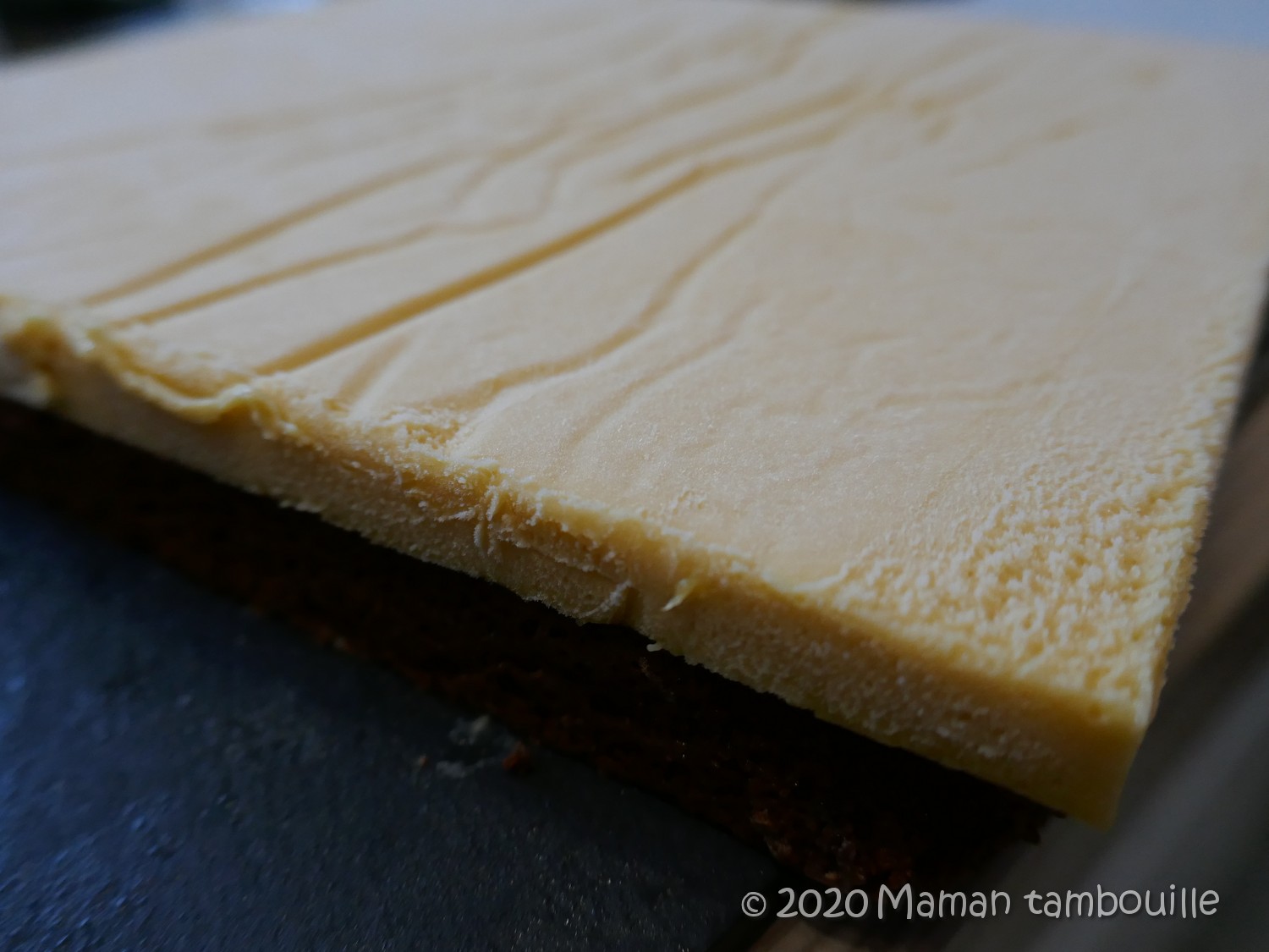 Poser ensuite le brownie chocolat. Appuyer un peu pour bien insérer le tout puis étaler correctement la crème sur les côtés et lisser le dessus si besoin.