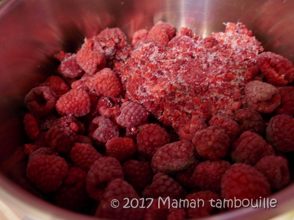 Mettre 160g de framboises dans une casserole avec le sucre. Chauffer doucement pour les en faire une compotée. Quand les framboises sont bien décongelées et fondantes, les mixer finement avec un mixeur à soupe.