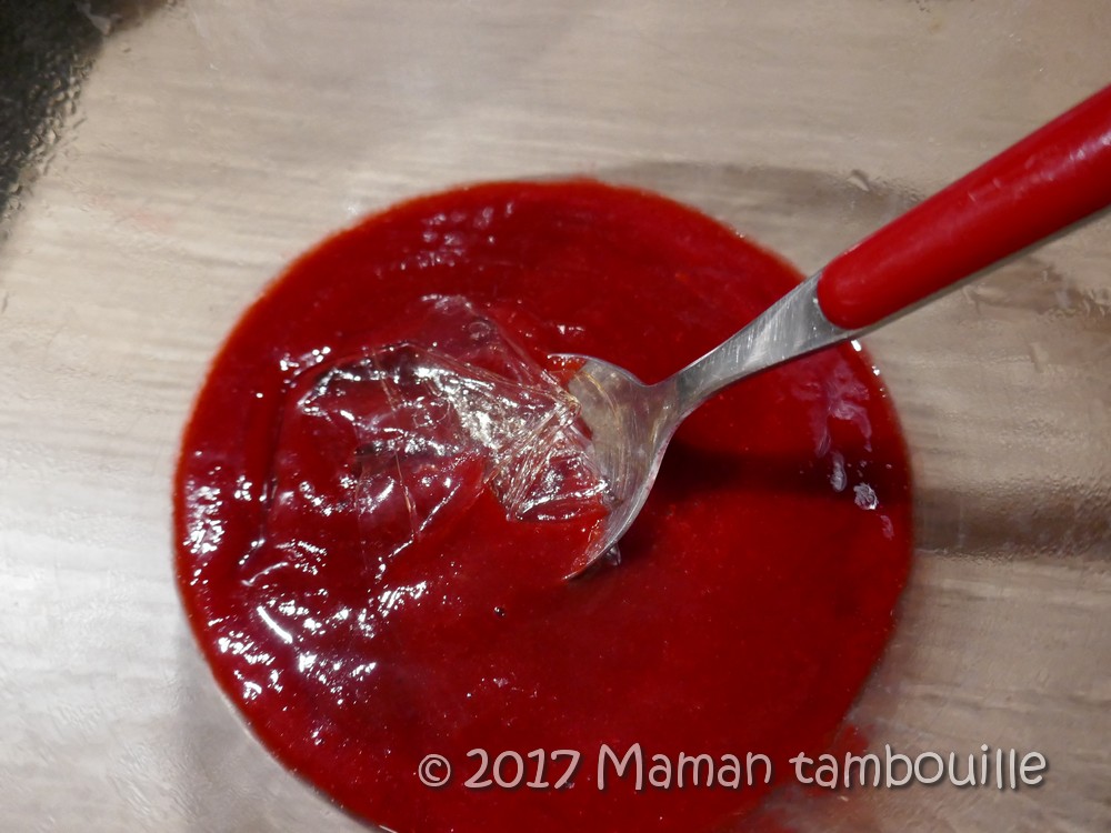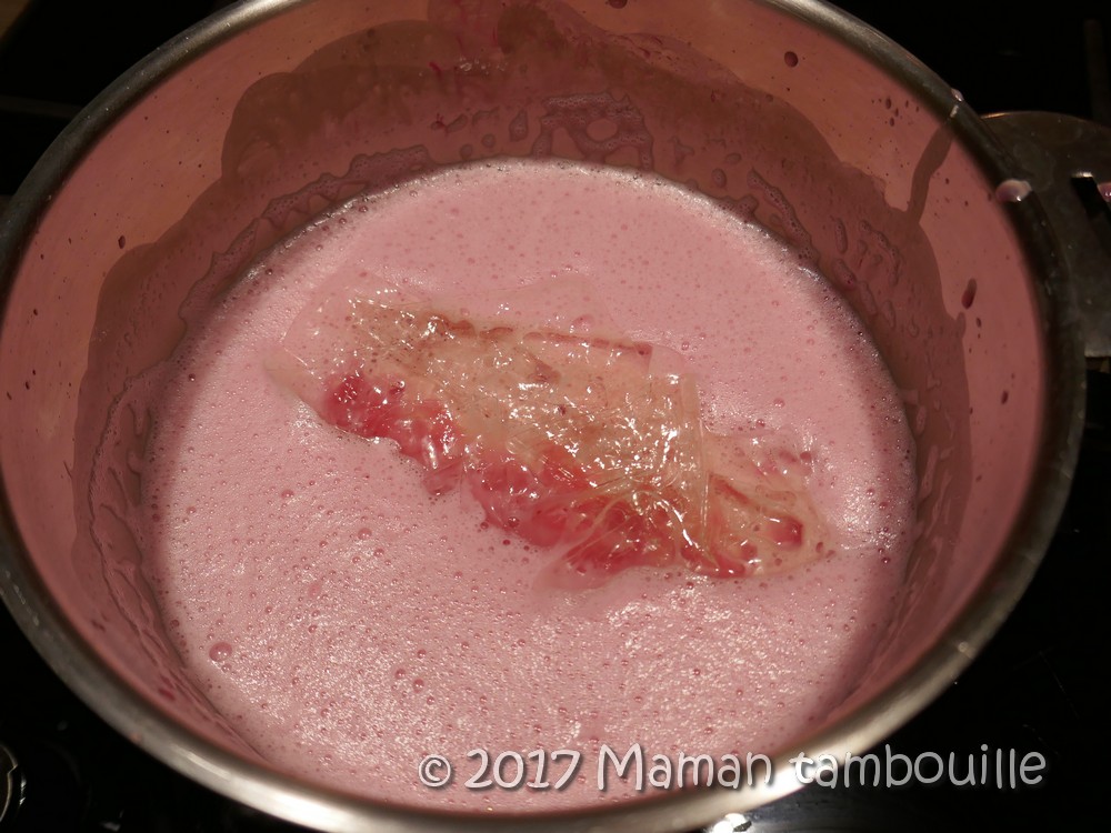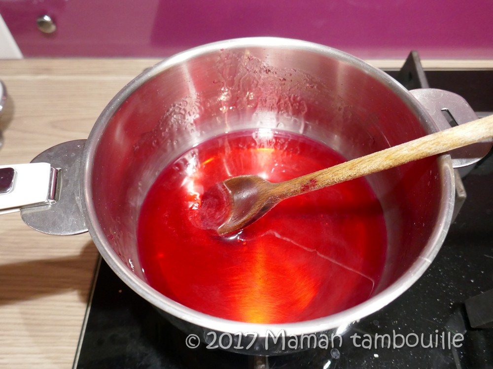 Dès que l’on obtient un sirop transparent, verser dans la pulpe de framboise et bien mélanger. Réserver.