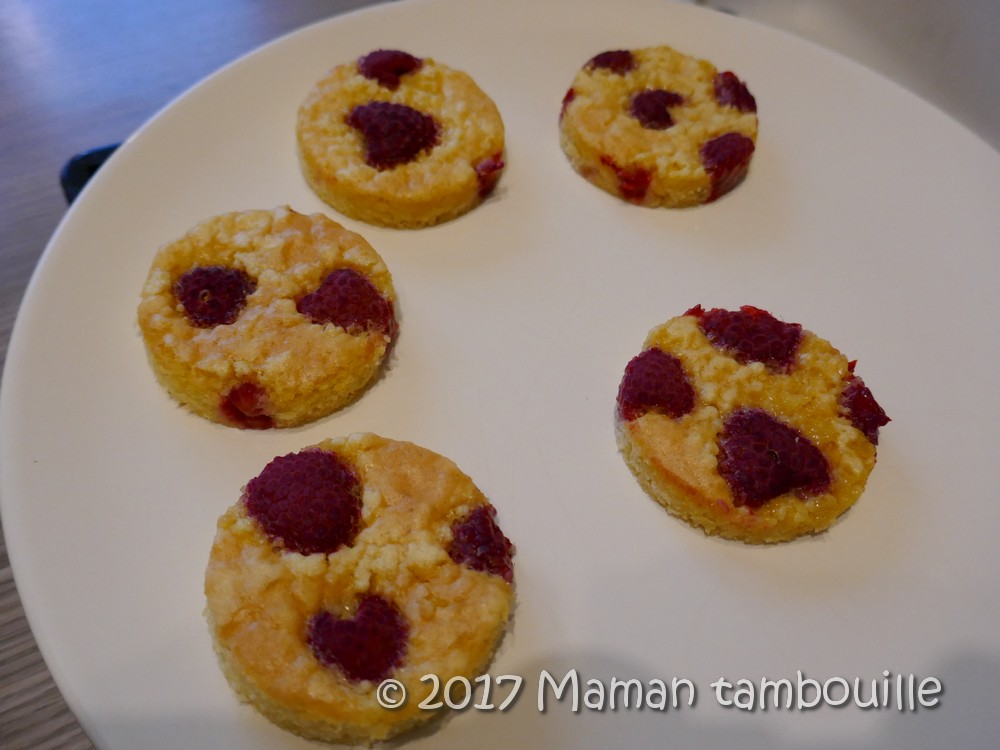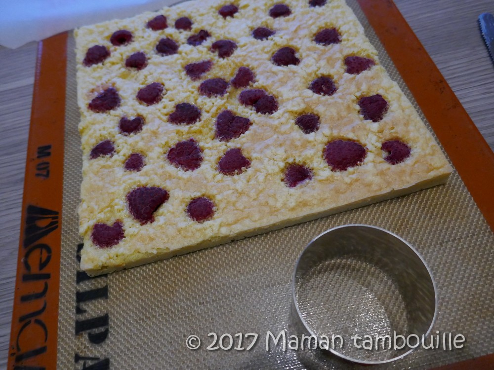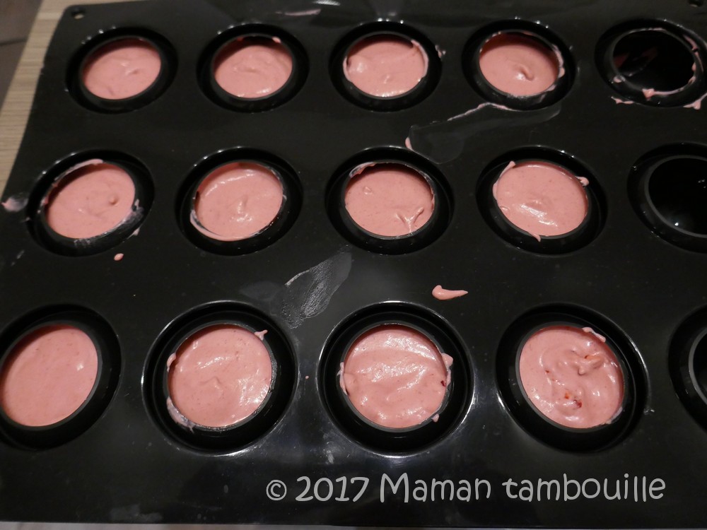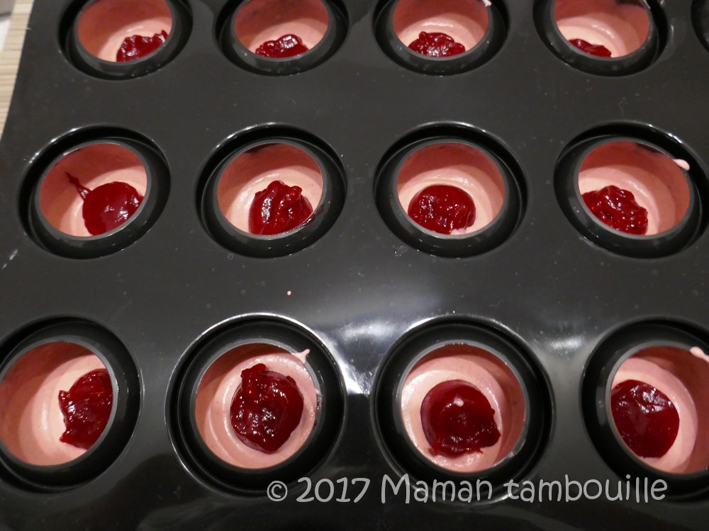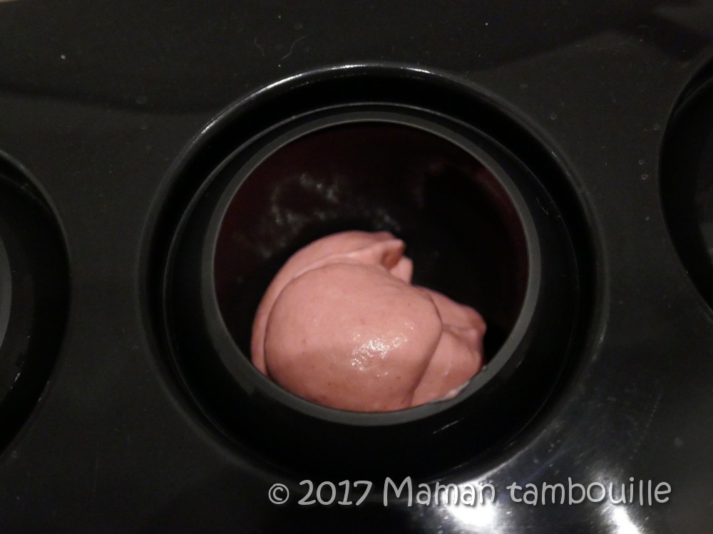 Ajouter dans chaque empreinte un insert de framboise congelé et démoulé.