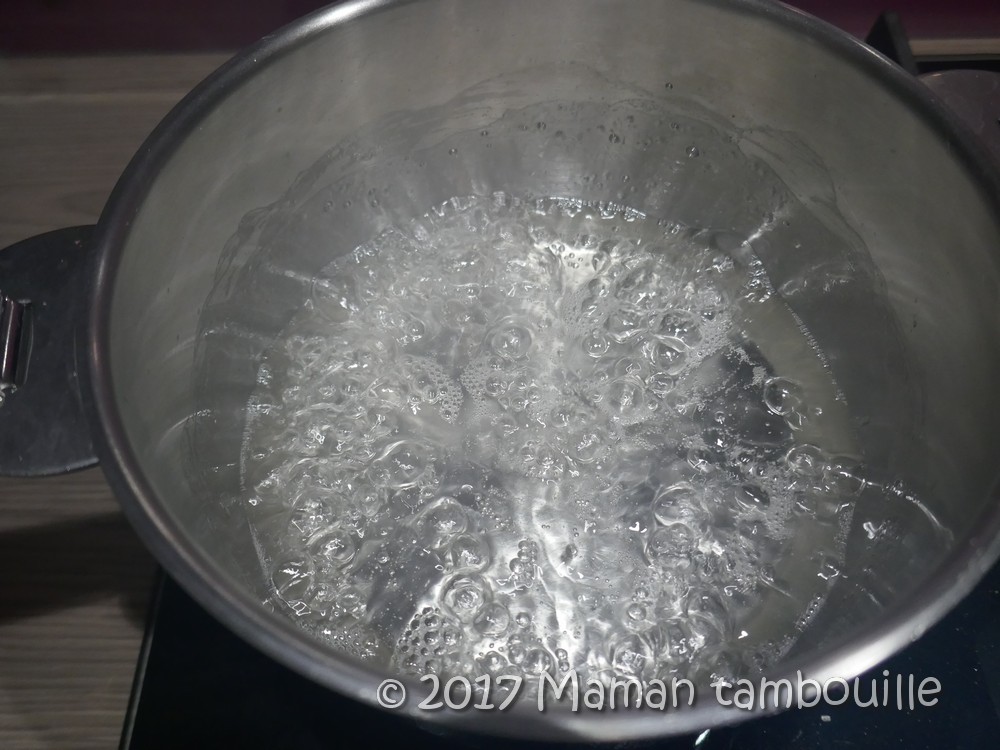 Dans une petite casserole, mettre 20g d’eau et 30g de sucre. Porter à ébullition.