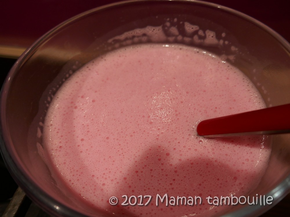 Dans la pulpe de framboise, ajouter la moitié de la meringue italienne.
