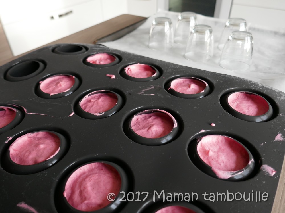 Pendant ce temps, préparer un plateau couvert de papier cuisson et y placer 9 petits verres retournés (on en voit 5 sur la photo).