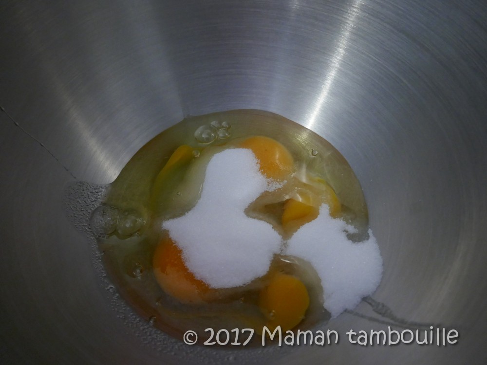 Dans un saladier, casser les 3 oeufs et ajouter les 45g de sucre.
