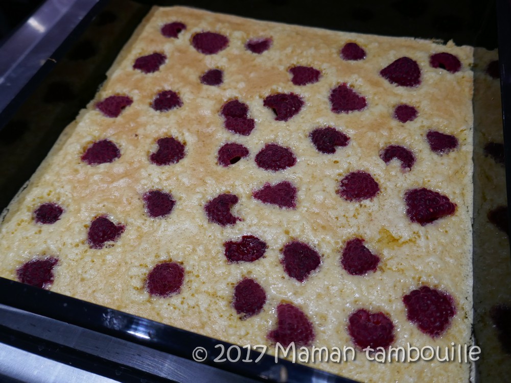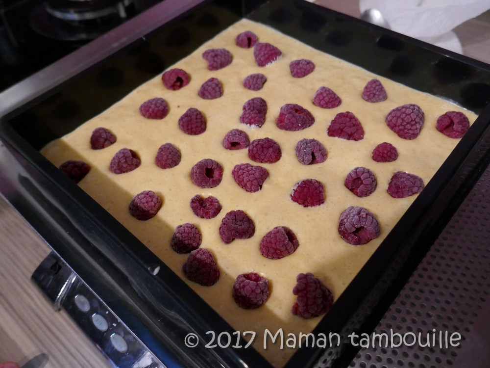 Répartir des framboises (encore congelées, ce n’est pas grave) dans la pâte.