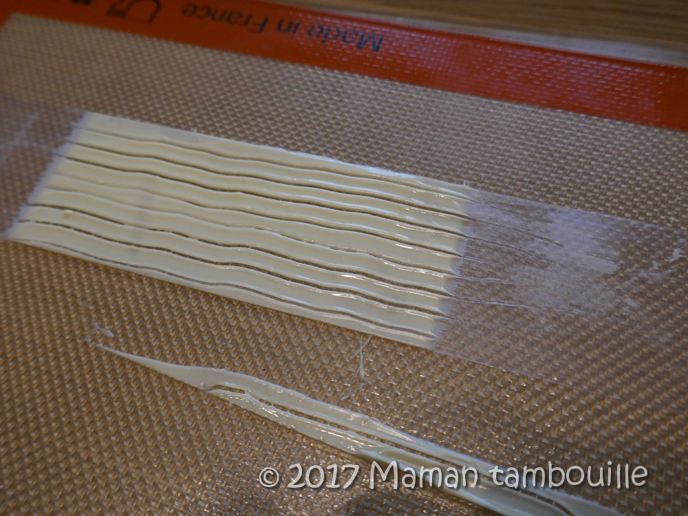 Au bout de 5 min, sortir le mug et décoller doucement le chocolat (attention il y aura sûrement un peu de casse, il faut en prévoir plus !). Eviter de toucher avec les mains pour ne pas faire fondre les bandes. Remettre les bandes décollées au frigo.