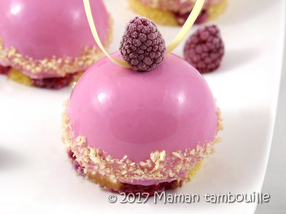 Ceux qui aiment les framboises devraient apprécier ce dessert composé d’une mousse à la framboise, d’un insert framboise, d’un biscuit à la framboise et même d’un glaçage miroir à la framboise ! Rien que ça ! On ne peut pas faire plus « framboise » je pense.