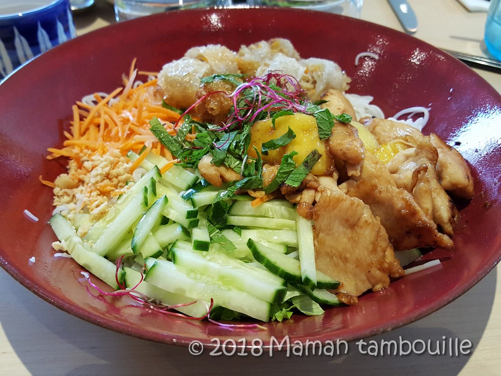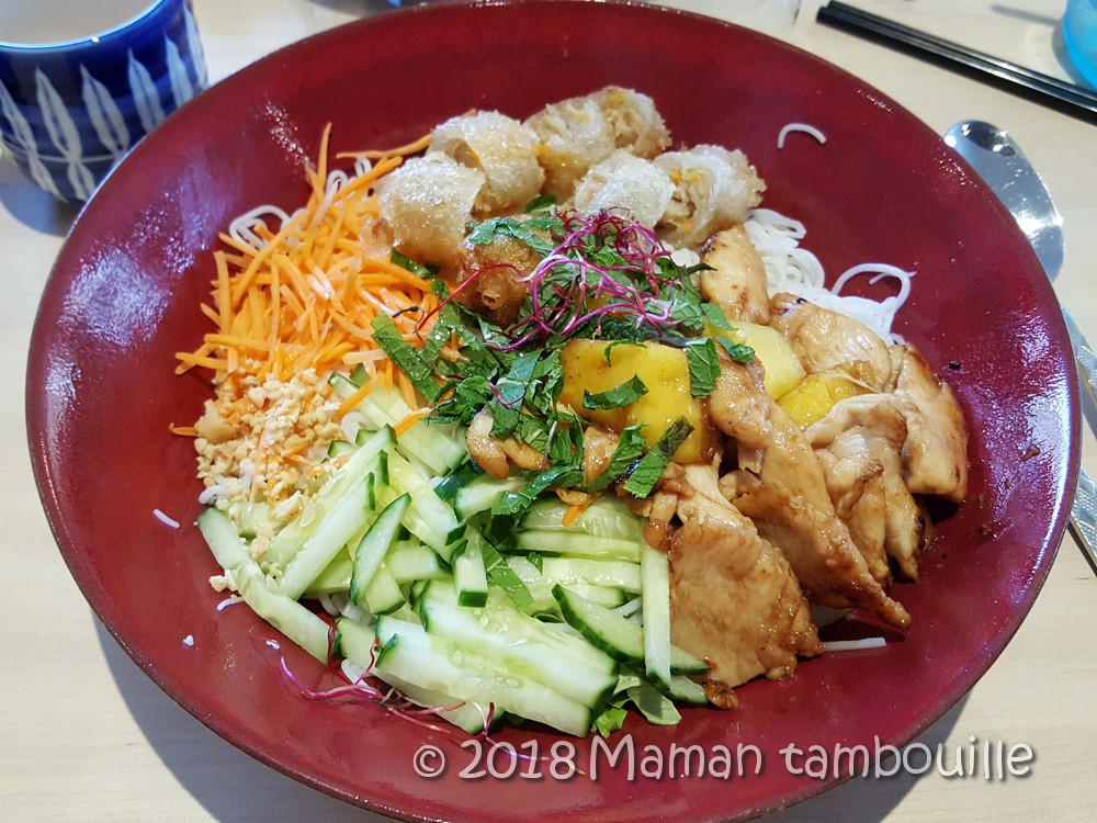 Un bo bun au poulet. L’assiette est super garnie et même très copieuse. Le poulet est bien assaisonné et très bien cuit. Les morceaux d’ananas sont poêlés ou rôtis, je ne sais pas trop, mais en tout cas, ils sont très bons. Les crudités apportent de la fraîcheur, c’est parfait sous cette chaleur.