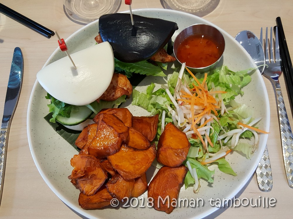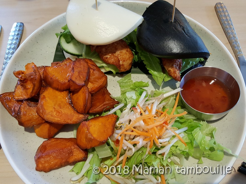 Un BAO KAI burger au poulet. C’est un burger (et même 2 burgers, un blanc et un noir) avec des pains cuits à la vapeur et garni avec du poulet à la citronnelle, concombre … le tout accompagné de crudités et de frites de patates douces. C’est bien parfumé, un régal.