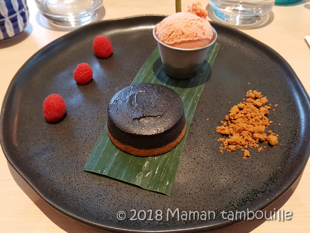 Et si après tout ça, vous avez encore faim, un petit dessert. Bon, j’avoue que je n’avais plus faim mais pas question de faire l’impasse sur le dessert que j’avais repéré sur la carte: un cheese cake au sésame noir et son sorbet à l’orange sanguine.