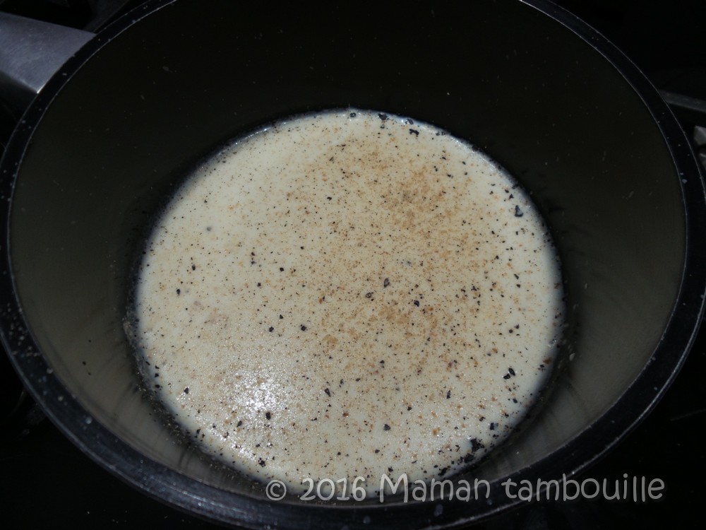 Porter le lait à ébullition. Retirer du feu et ajouter la gélatine bien essorée entre les mains. Mélanger pour la dissoudre.