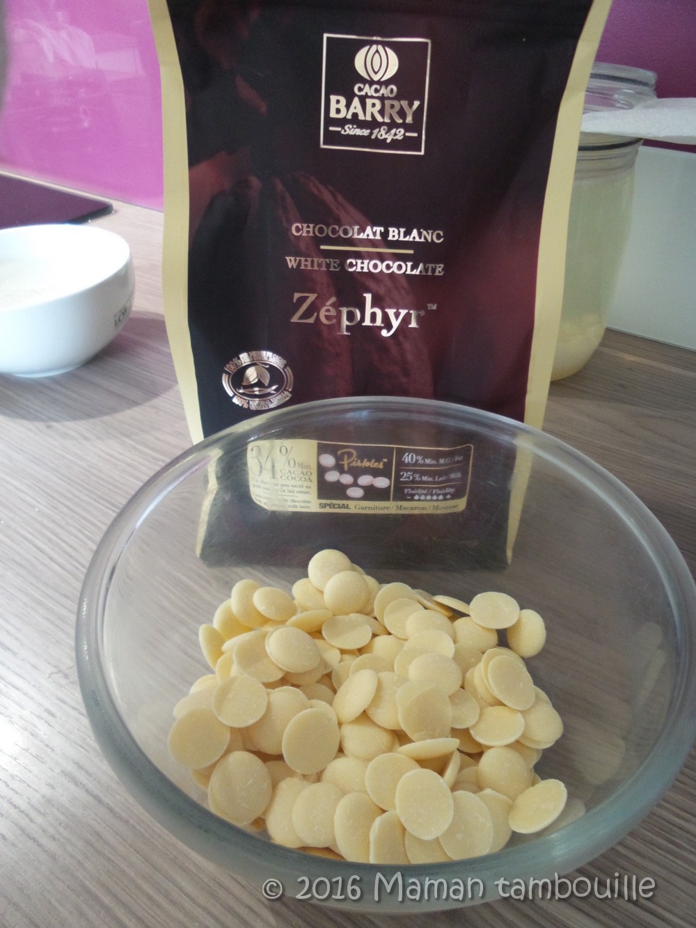 - 240g de chocolat blanc pâtissier (chocolat blanc en pistoles Barry pour moi)
