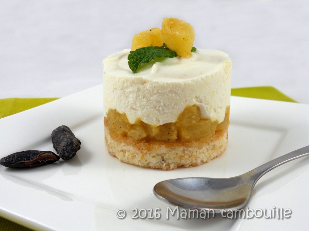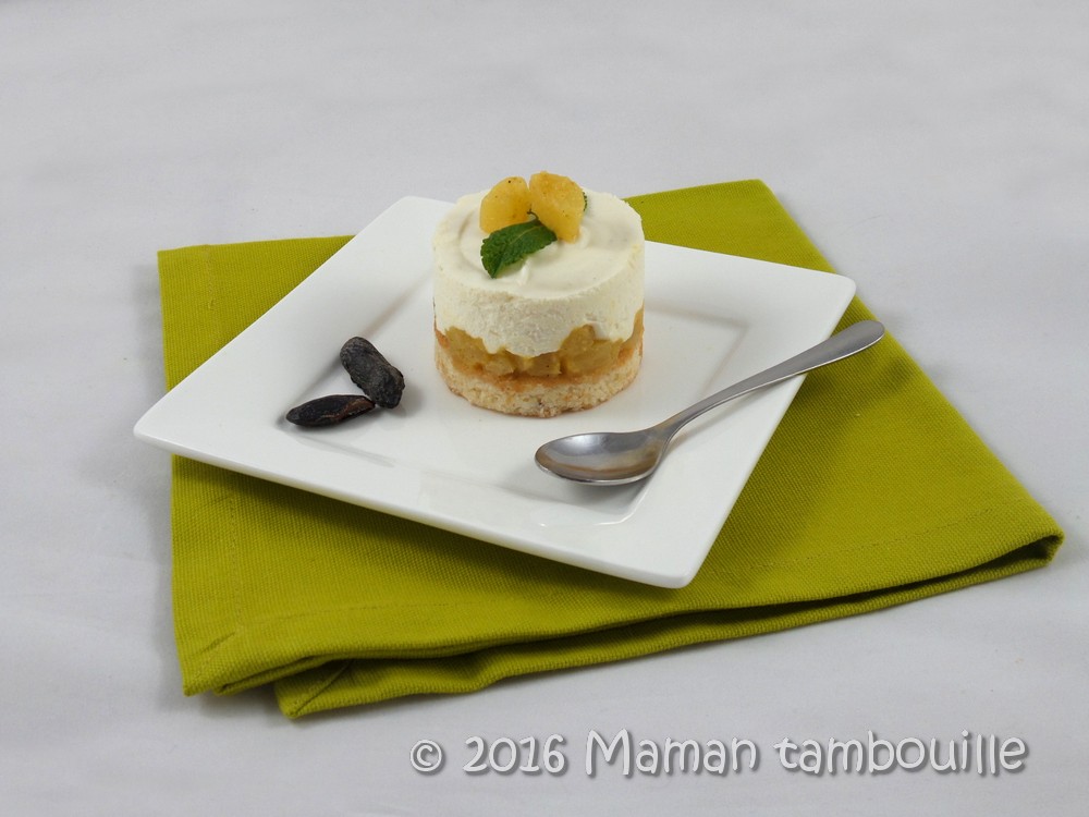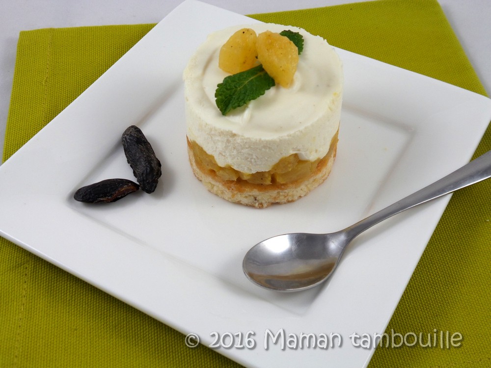 Voici donc le dessert que j’ai fait pour le nouvel an, des petits entremets individuels composés d’un financier coco, d’une compotée d’ananas et fruits de la passion et d’une mousse ivoire légère à la fève tonka.