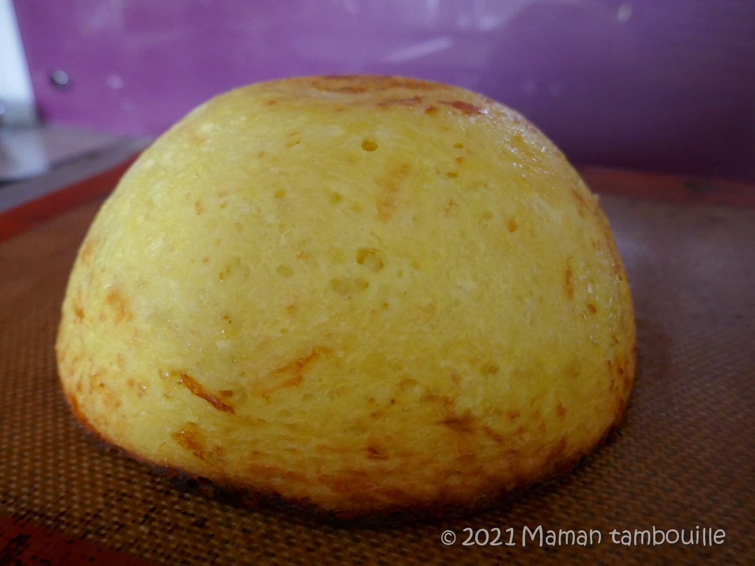 Cuire environ 1h à 180° en chaleur tournante (avec vapeur pour moi). Si le dessus a tendance à griller, couvrir le moule d’un papier alu.