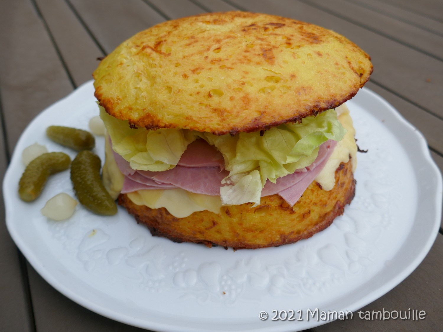 Vous voyez le truc arriver ? Dans un même plat, « burger », « patate », « raclette » et en plus « maxi », là on n’est pas loin du graal, non ? J’avais pas trop d’idées ce jour. J’avais un reste de fromage à raclette et du jambon. J’ai pensé à un gâteau de pommes de terre mais j’avais envie de le faire différent de d’habitude. En voyant mon gros moule dôme, j’ai pensé à un gros burger à partager. Bingo, c’est parti pour une impro !