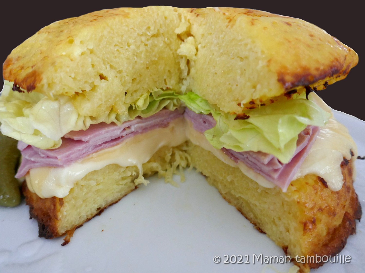 A la sortie du four, poser la base sur le plat. Ajouter les tranches de jambon, de la salade, de la sauce burger si vous voulez).