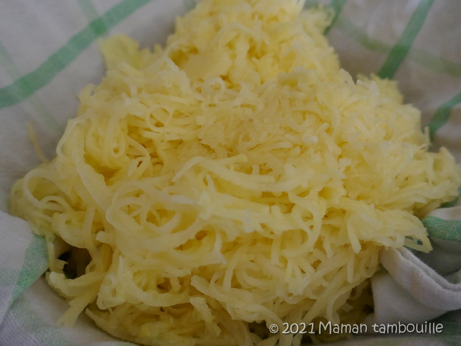 Mettre les pommes de terre râpées dans un torchon propre et le presser pour faire sortir le maximum de jus des pommes de terre.
