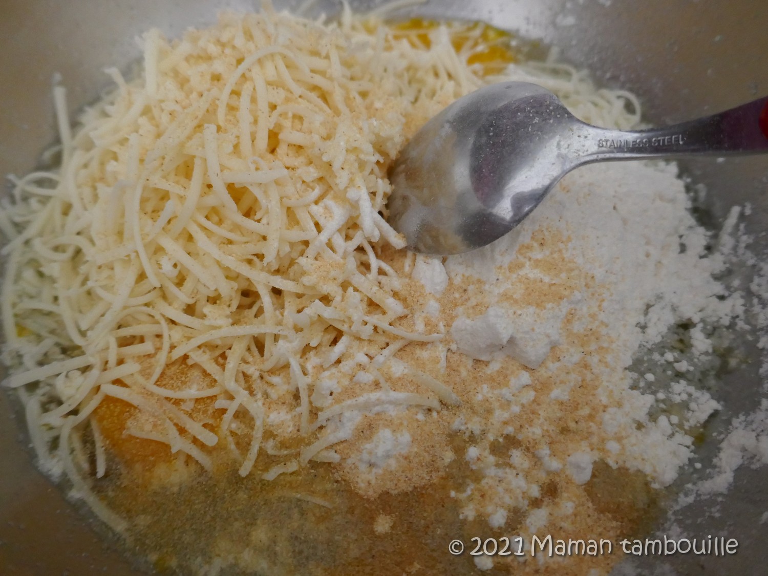 Mettre les pommes de terre dans un saladier. Ajouter les oeufs, la farine tamisée, le parmesan, du sel et une cuillère café d’ail en poudre. Bien mélanger. Ajouter le beurre fondu et mélanger.