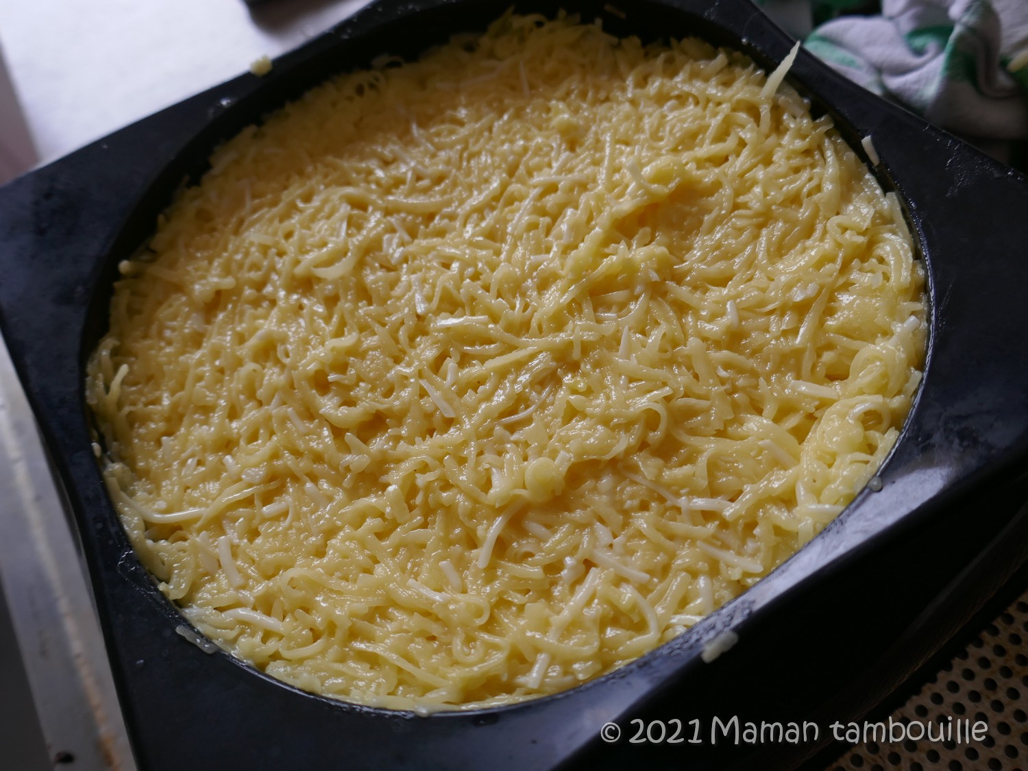 Déposer généreusement des tranches de fromage sur la base et l’enfourner 5-10 min le temps que le fromage devienne bien fondant. (Mettre à côté le chapeau du gâteau pour qu’il reste chaud).