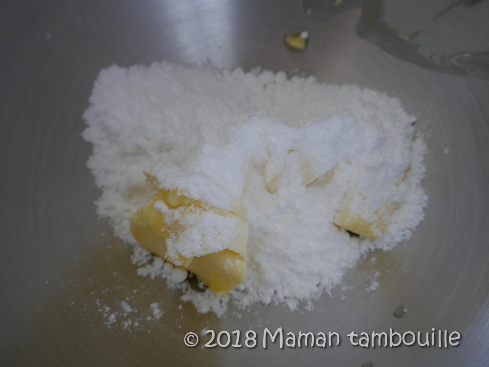 Dans un saladier (ou robot avec la feuille), mélanger le beurre pommade et le sucre glace pour bien le crémer.