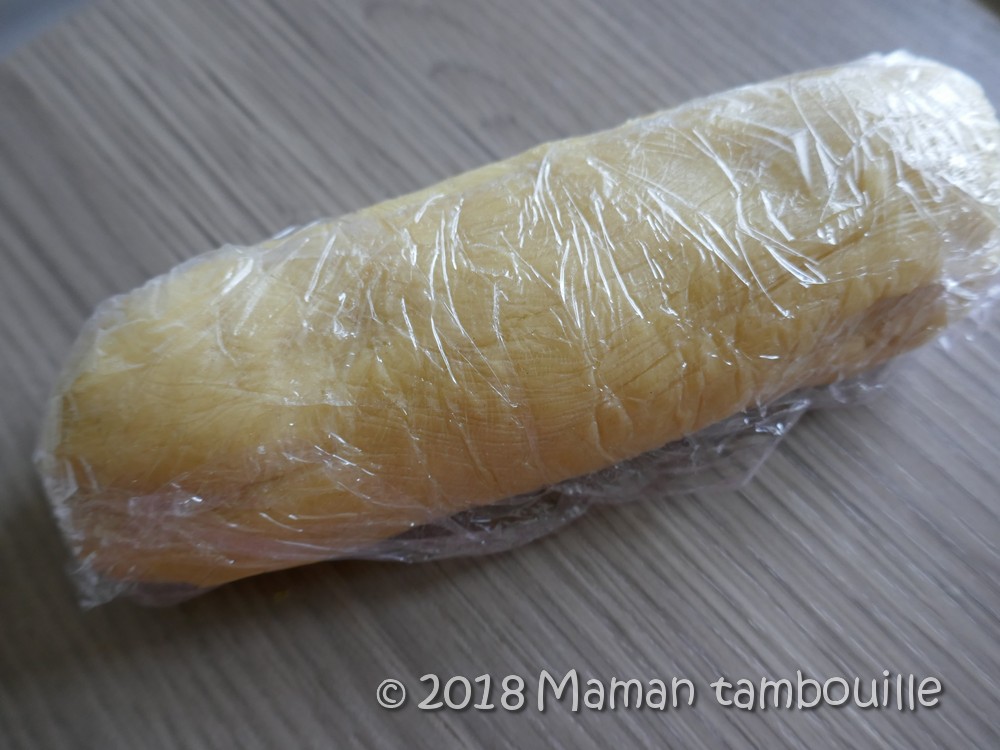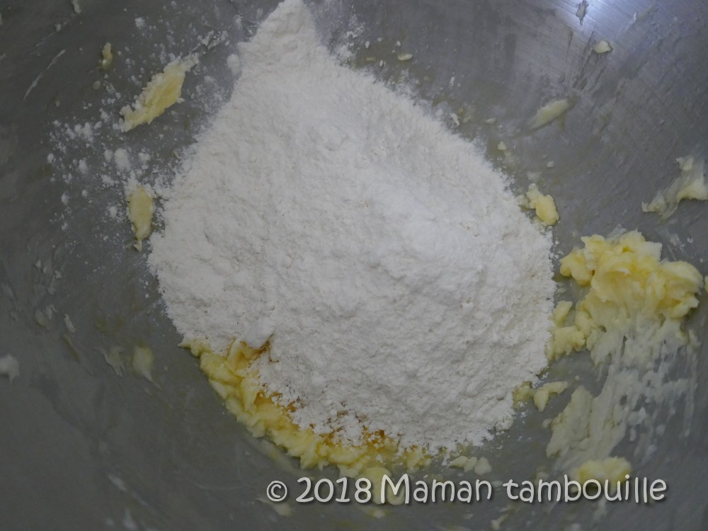 Ajouter la farine et la poudre d’amande. Mélanger puis former une boule.