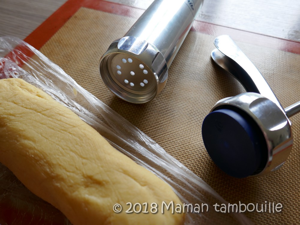 Couper la pâte en 3 et mettre un morceau dans la presse à biscuit en ayant mis un embout avec des petits ronds (comme sur la photo).