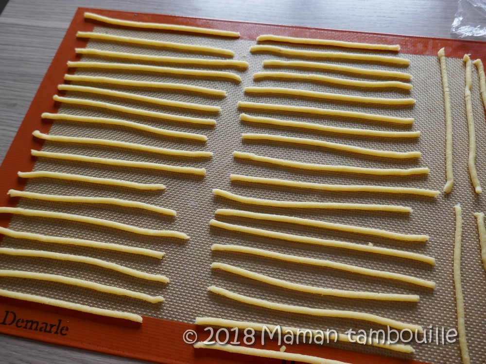 Couper doucement en haut avec un couteau bien tranchant et séparer les fils. Les déposer sur une silpat et ajuster leur longueur si besoin avec un couteau pour avoir des bâtons réguliers.