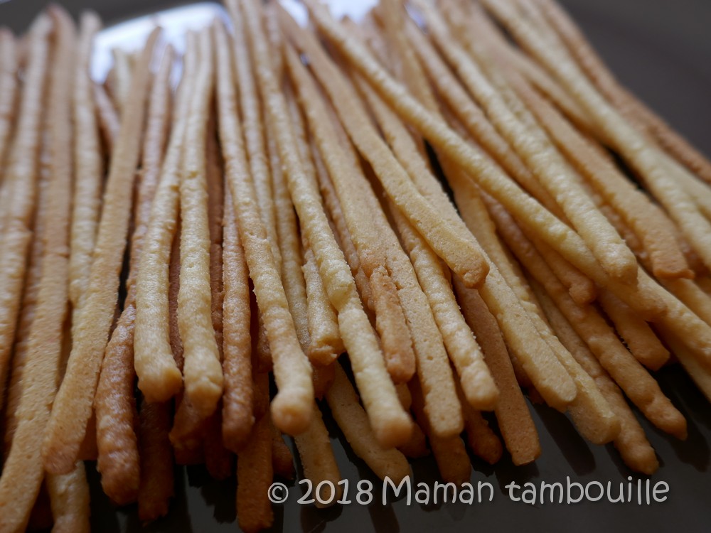 Je suis plutôt fière de mes mikados maison et surtout de la technique que j’ai utilisée pour faciliter le travail qui permet d’éviter de rouler chaque petit bâtonnet entre les mains ou encore d’étaler la pâte et de couper des lanières. En effet, je voulais des bâtonnets bien ronds et surtout très fins. Mon petit secret: la presse à biscuit 😉 Je vous explique tout ça dans la recette.