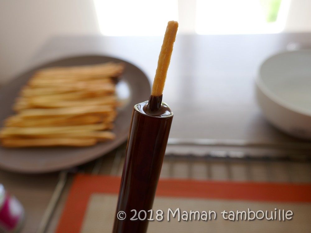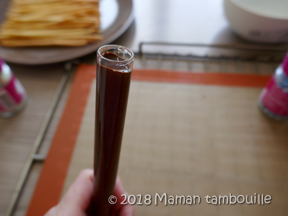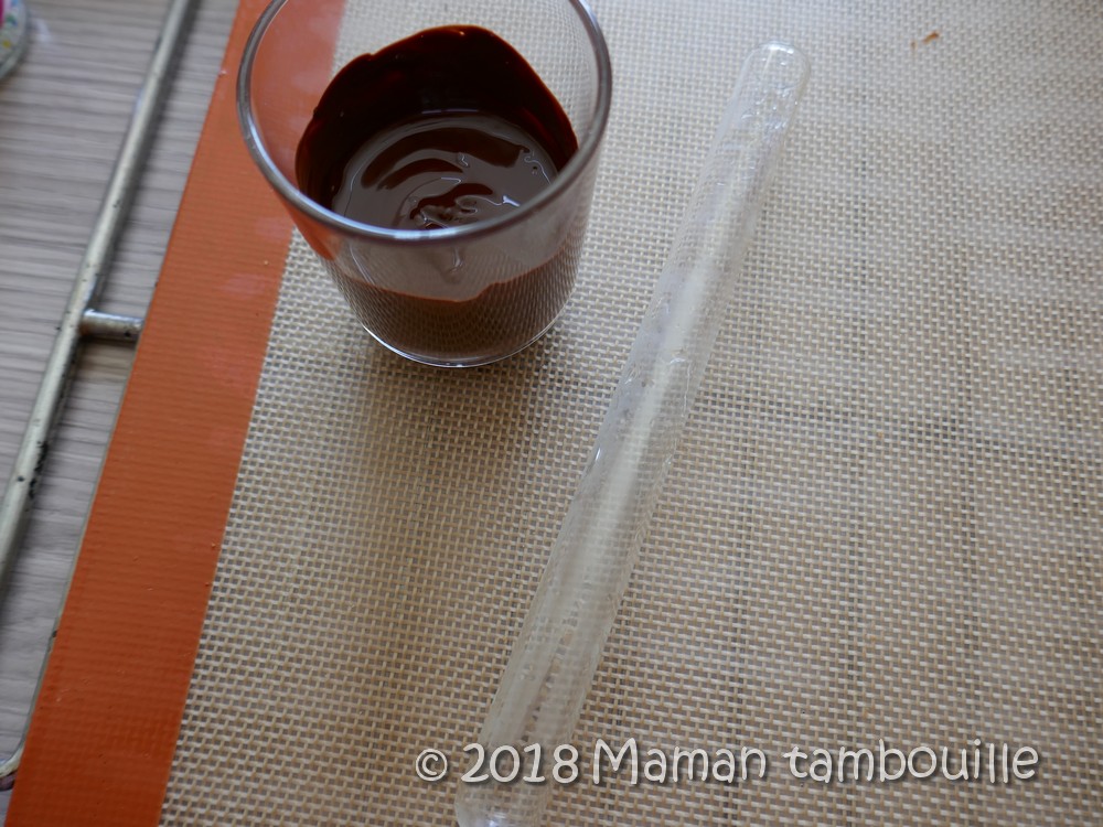 J’ai cru bon de mettre le chocolat fondu dans une pipette en verre pour y tremper les bâtons.