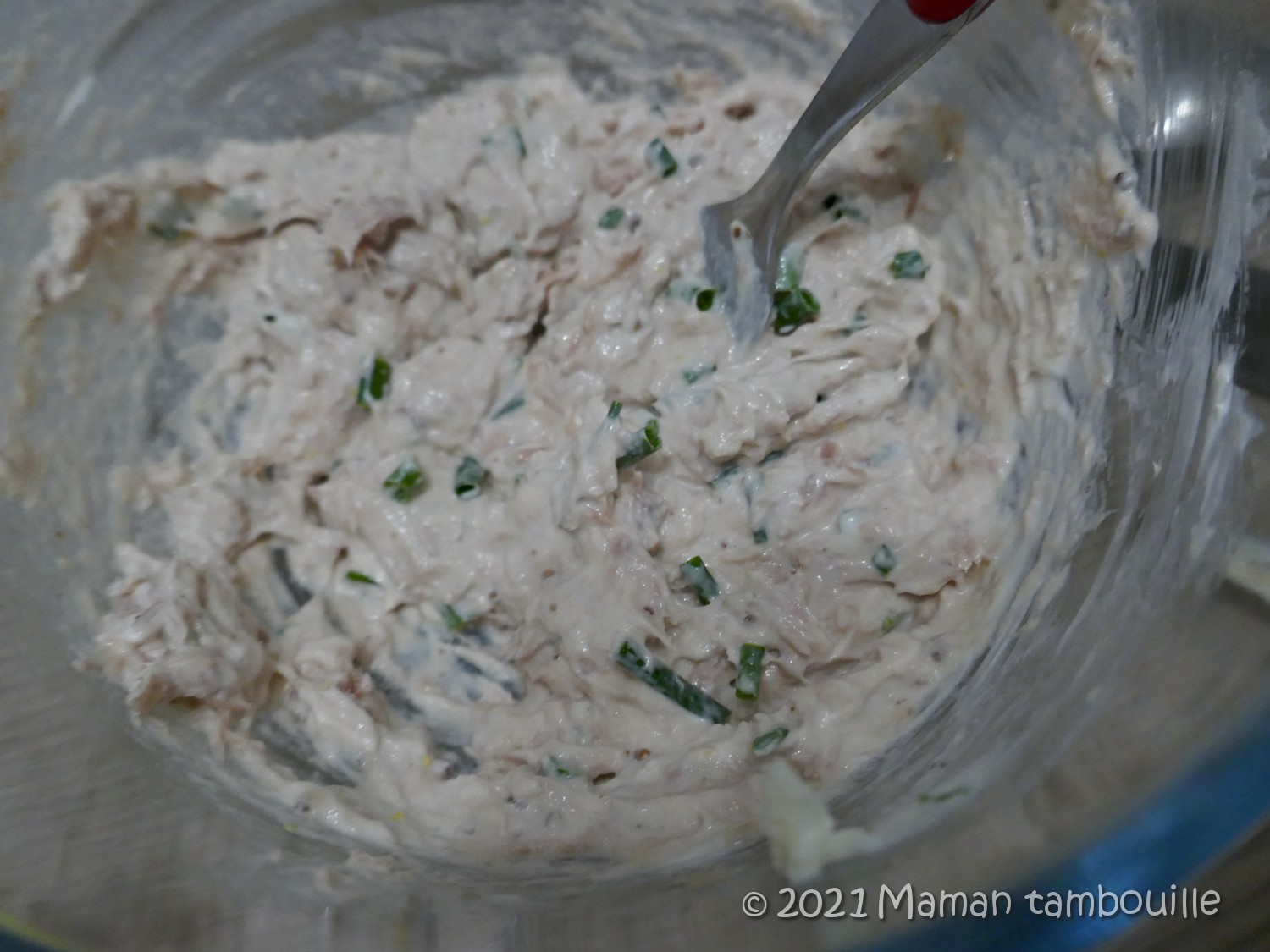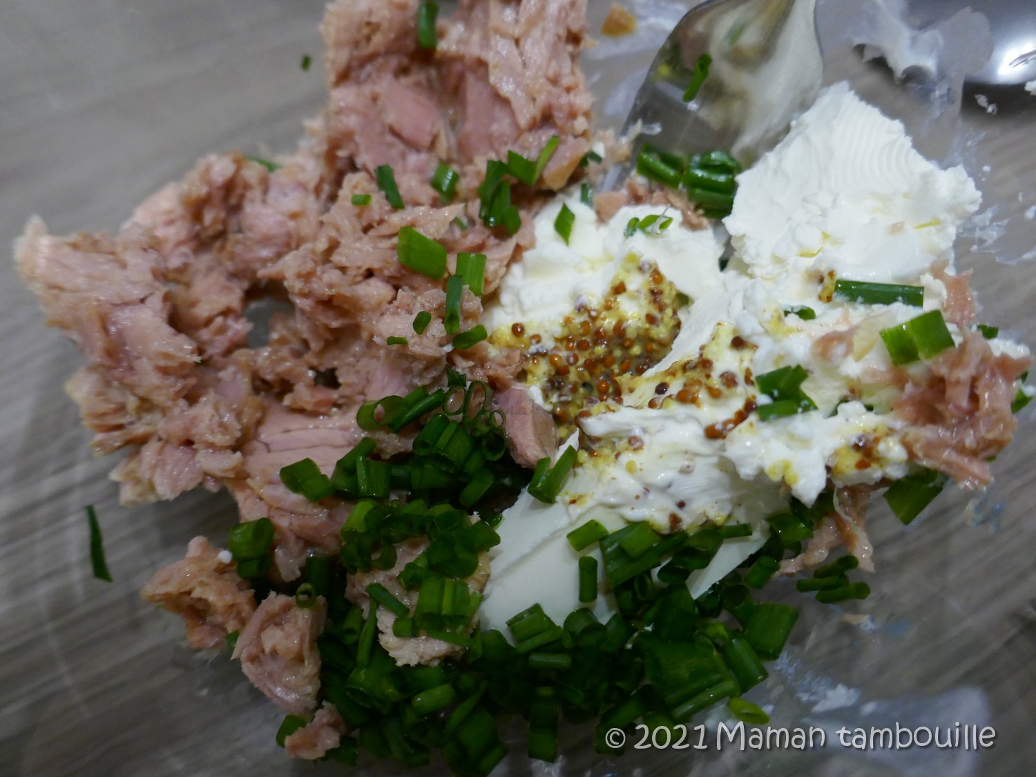 Dans un saladier, mélanger le thon égoutté, le fromage, la ciboulette ciselée, la moutarde et du sel.