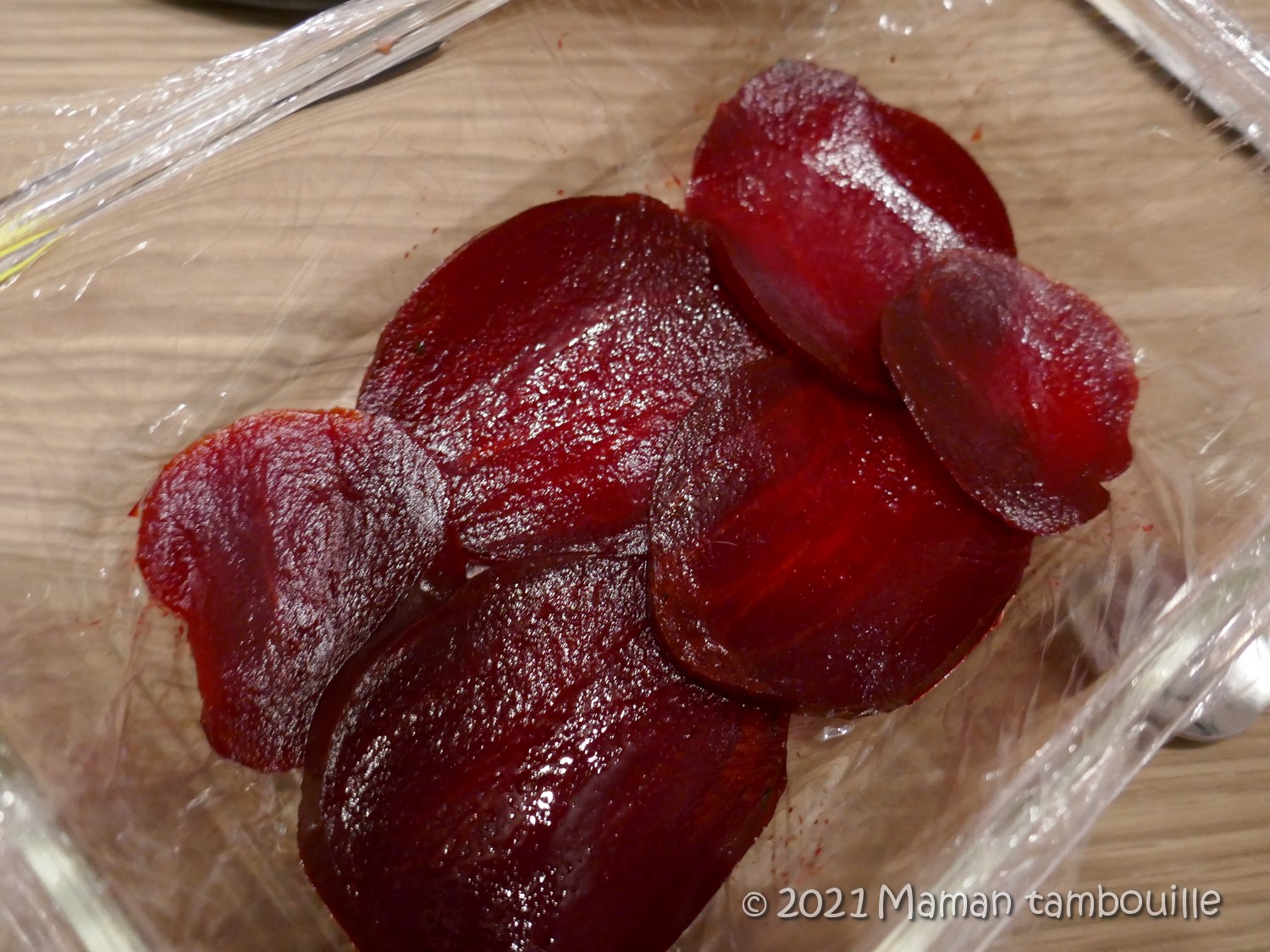 Couper la betterave en tranches fines (avec une mandoline, c’est parfait).