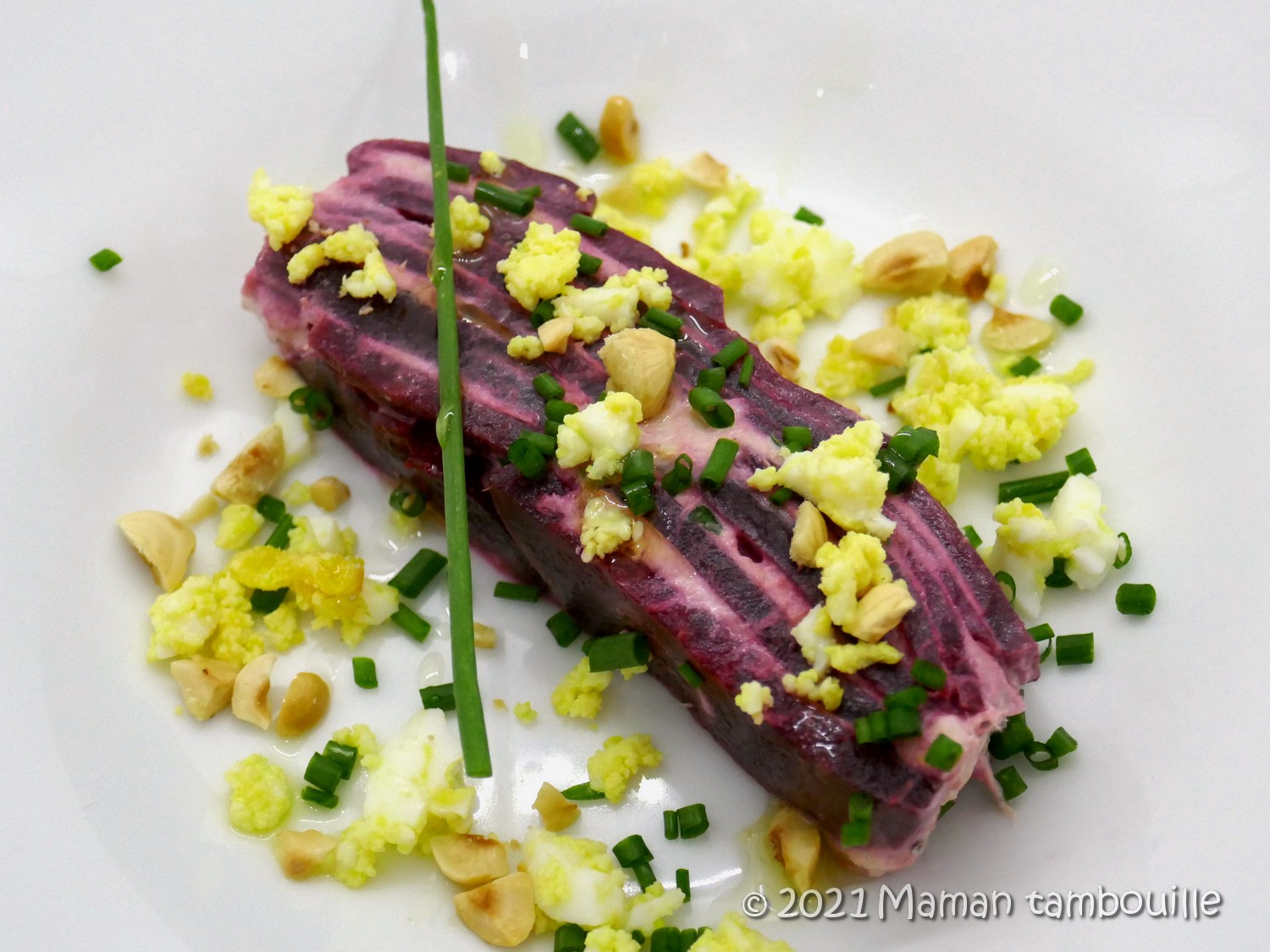 Servir une tranche de mille feuilles, parsemer d’oeuf, de noisettes concassées, de ciboulette puis arroser d’un filet d’huile d’olive ou de noisette.