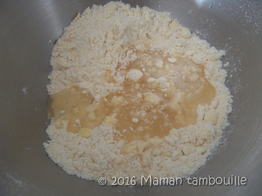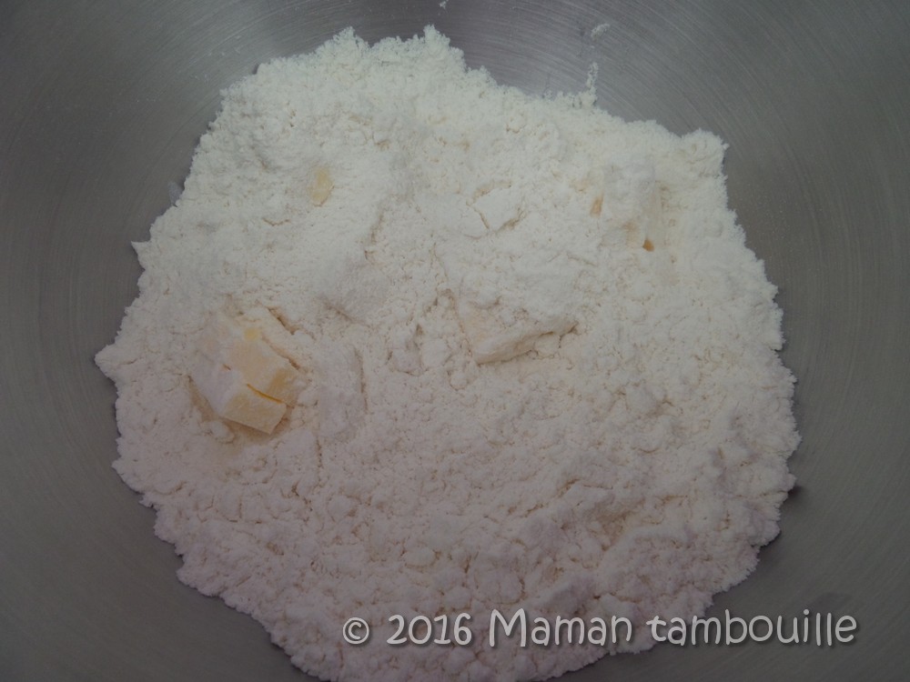 Ajouter le beurre coupé en morceaux et mélanger du bout des doigts pour former un mélange sableux.