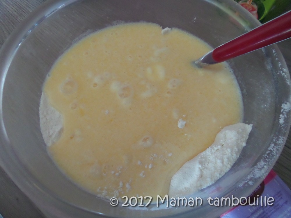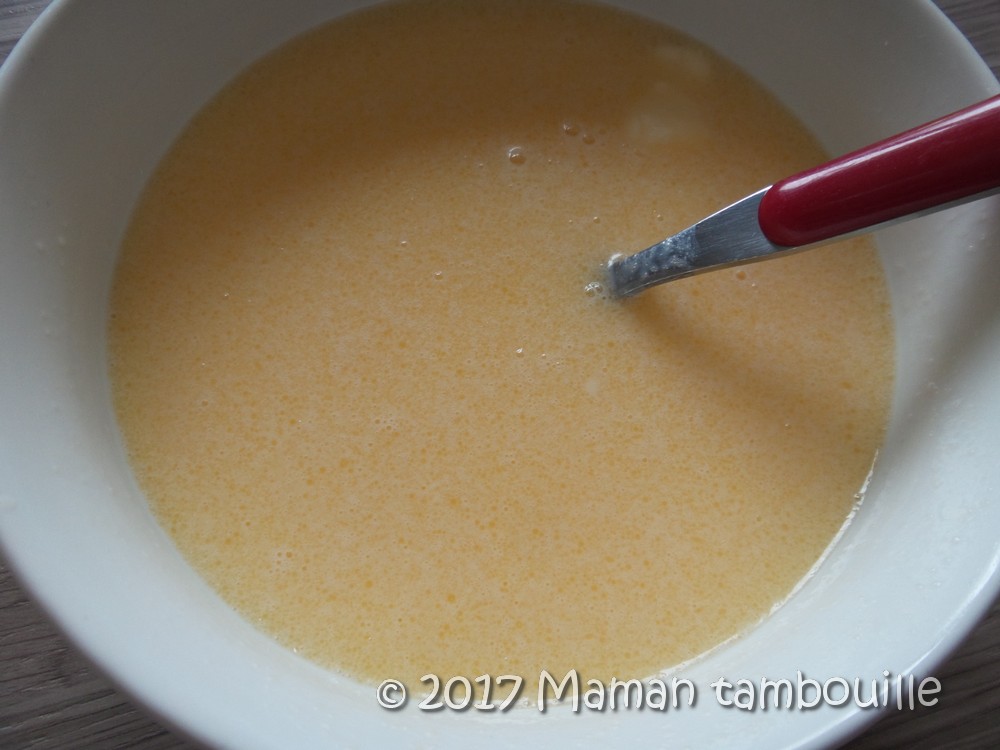 Dans un bol, faire fondre le beurre puis ajouter le lait et les œufs et bien mélanger.