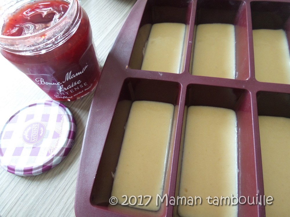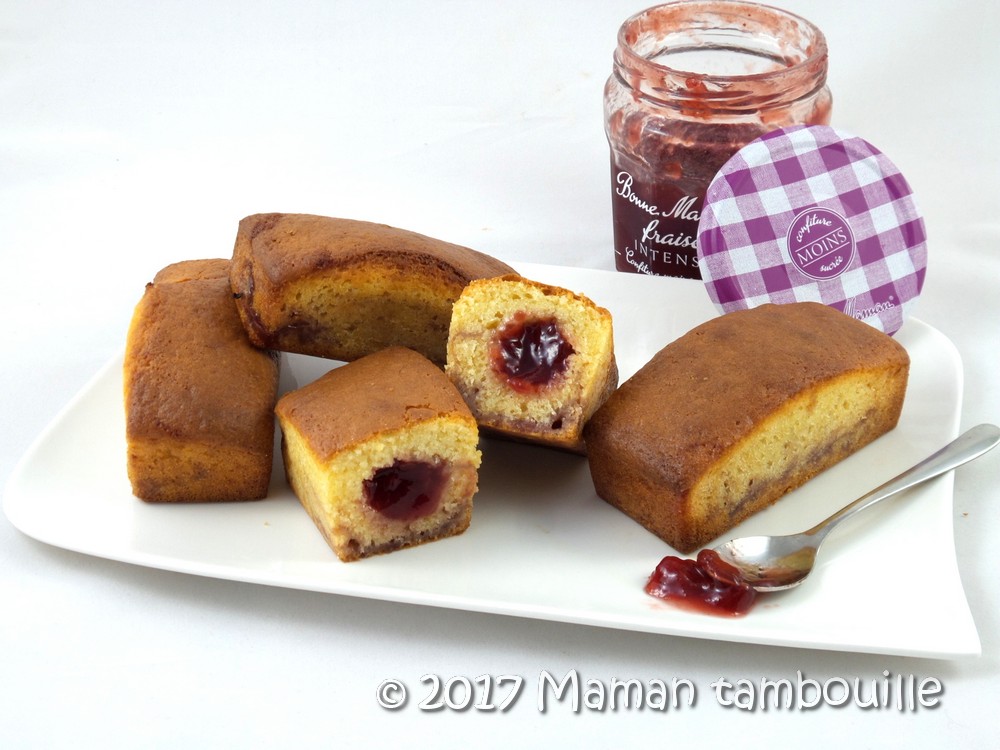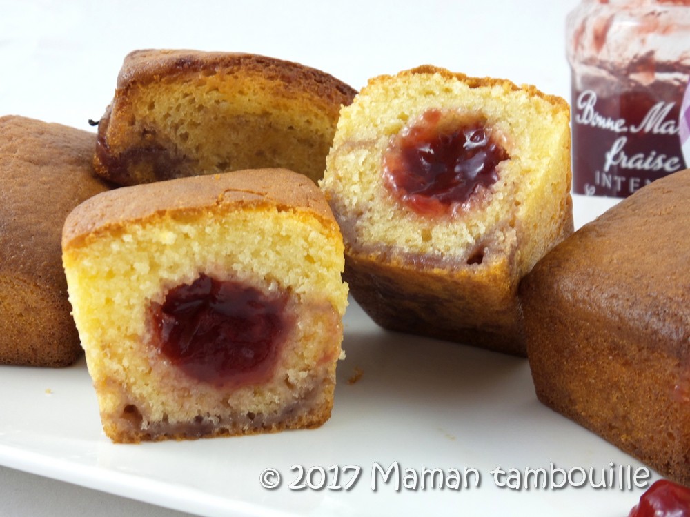 Bon, ils sont faciles à faire et très bons. Par contre, j’ai eu un souci avec la confiture qui s’est noyée dans le fond des gâteaux. Du coup, quand je les ai coupés, je les ai creusés pour y remettre de la confiture. Il me faudra trouver une astuce pour faire tenir cette confiture à la cuisson, à moins que la solution ne soit de les fourrer une fois cuits ?
