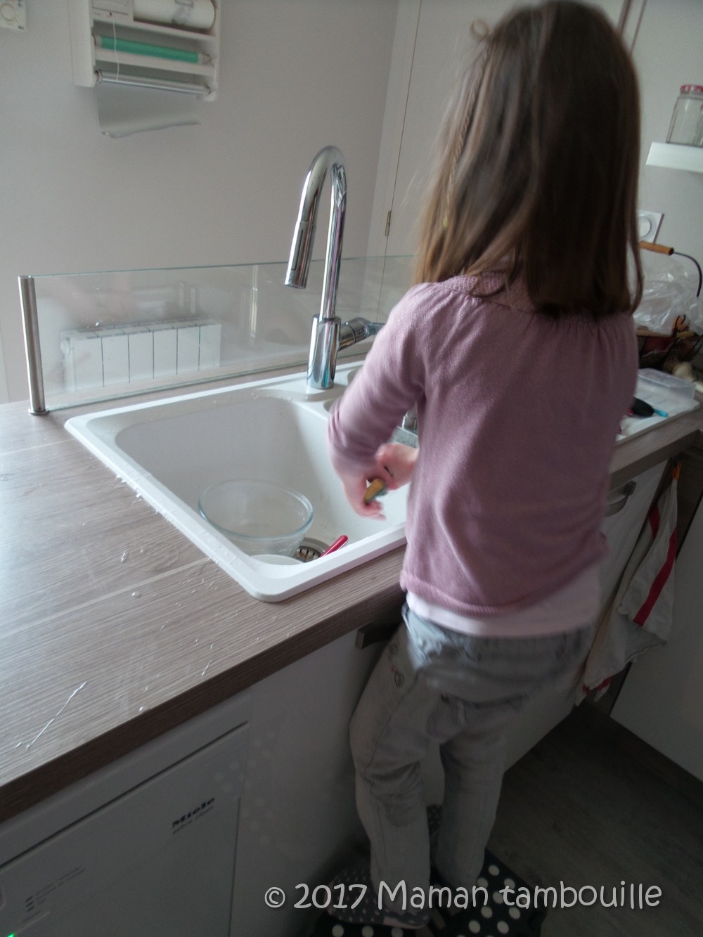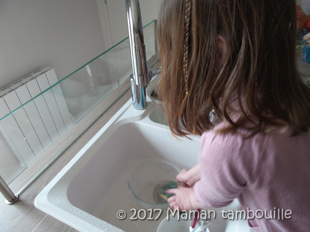 Ensuite, il faut faire la vaisselle mais pour cette fois, ma puce avait décidé que c’était très très amusant de faire la vaisselle alors je l’ai laissé faire en la remerciant … et en attendant qu’elle ait quitté la cuisine fière d’elle pour tout relaver 😉