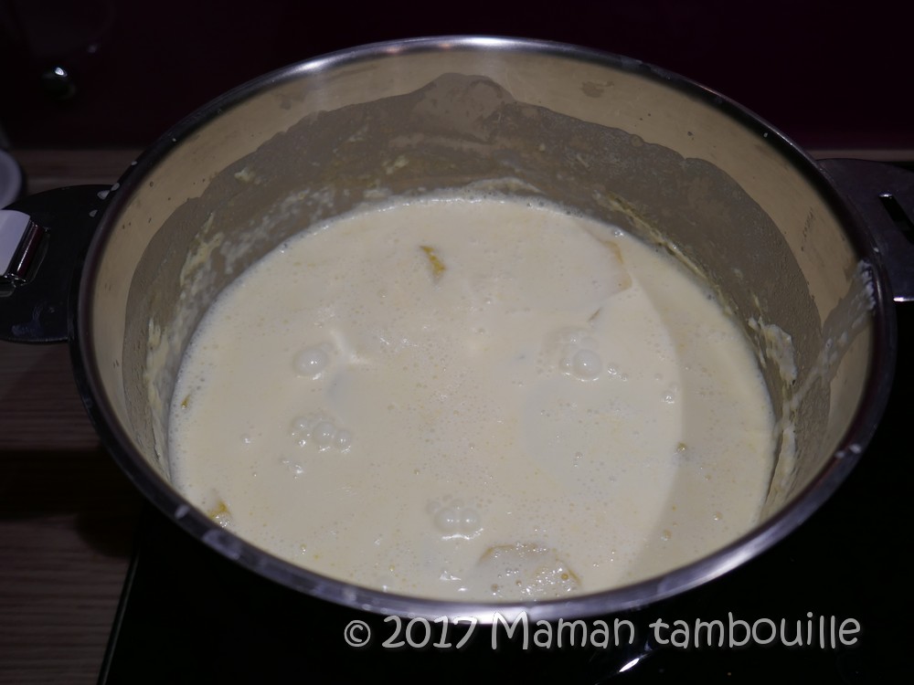 Mixer les pommes de terre et la crème dans la casserole. Arrêter de mixer quand la texture est juste lisse mais ne pas insister plus longtemps, cela deviendrait trop élastique.