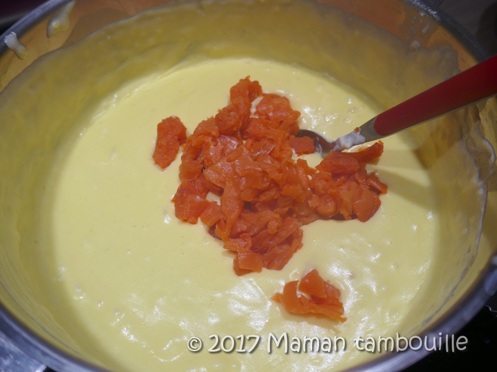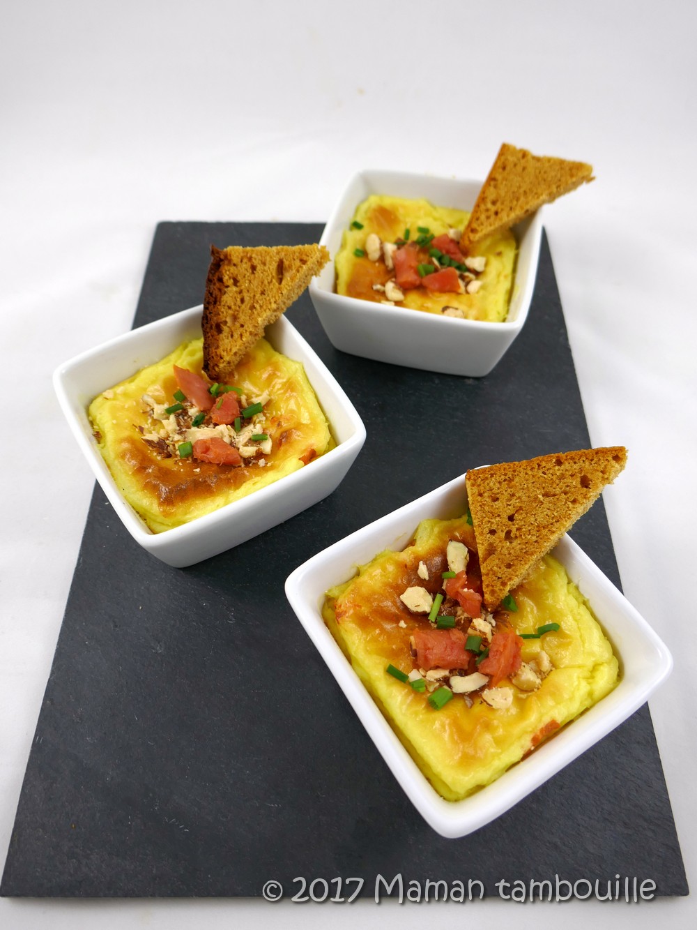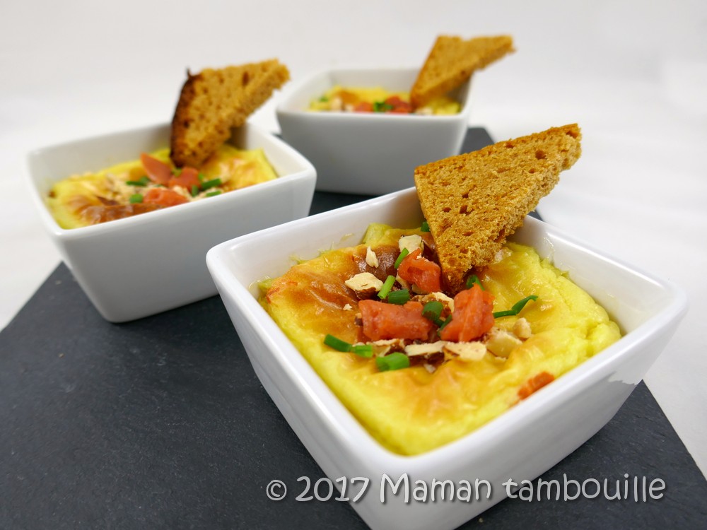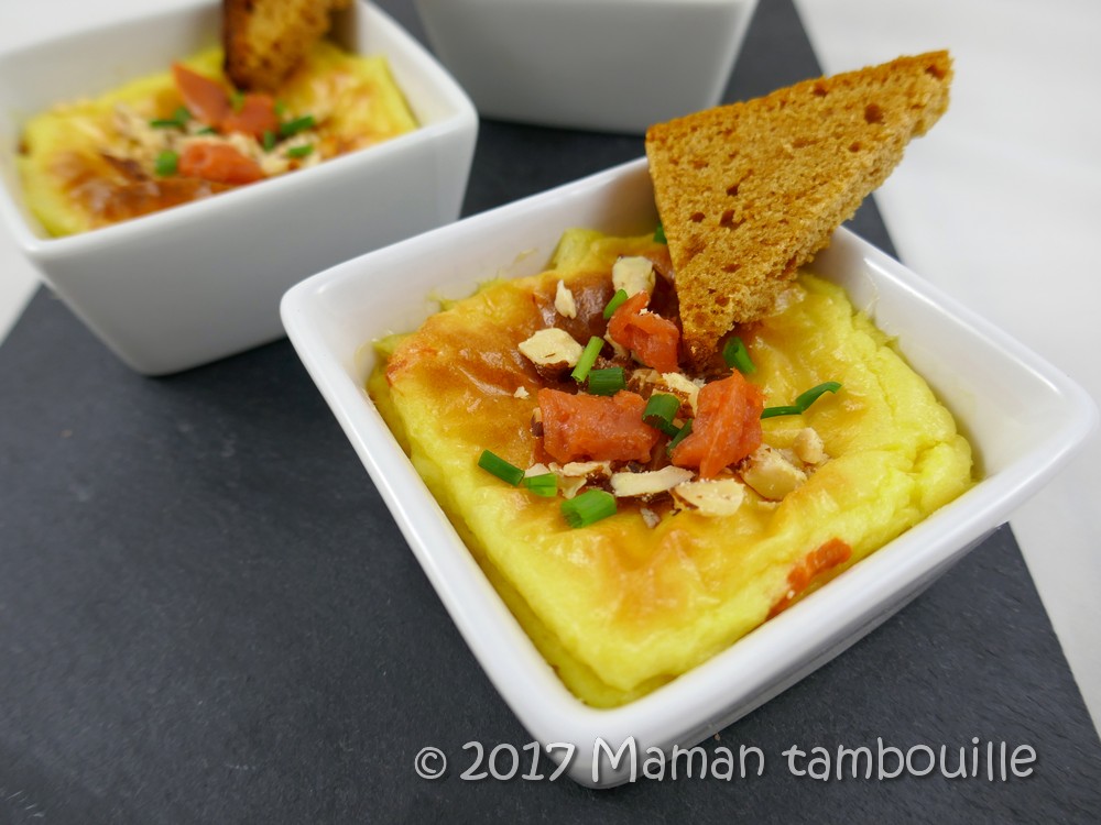 Je me suis tournée vers une recette trouvée ICI et intitulée « crème brûlée de pommes de terre au saumon fumée ». Après dégustation, j’ai décidé de renommer cette recette « mousse de pomme de terre au saumon fumé », d’une parce que la texture n’a rien à voir avec celle d’une crème brûlée mais se rapproche plus d’une mousse, voire d’un soufflé, et de deux car ces petites verrines n’ont rien de « brûlées », point de sucre caramélisé au chalumeau ici. En tout cas, nous avons beaucoup aimé ce plat qui pourrait très bien trouver sa place sur une table de Noël ou en verrines apéritives.