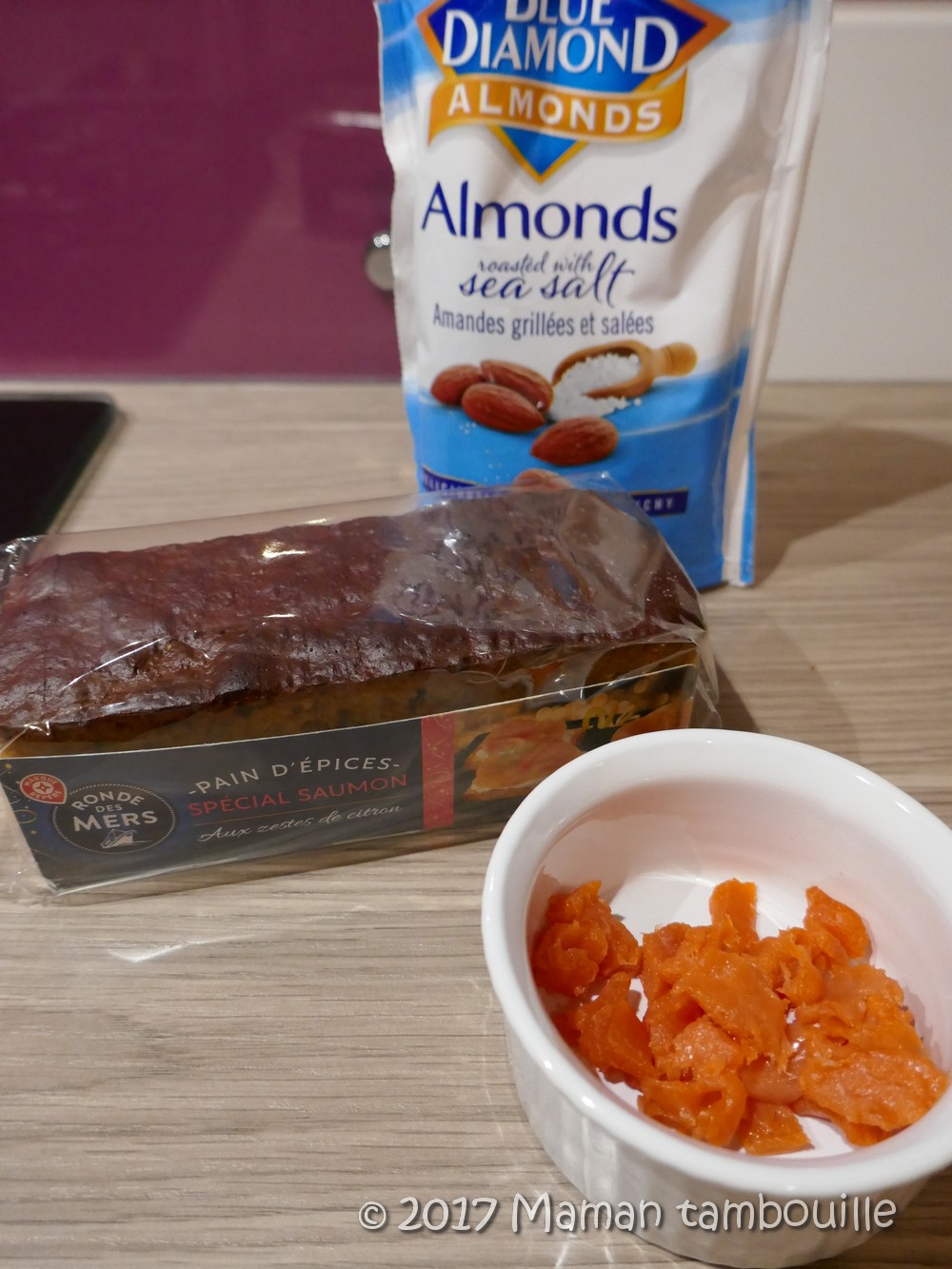 Dans la dernière Degustabox, j’ai reçu du pain d’épices spécial saumon fumé. Celui-ci est légèrement citronné pour s’associer avec le saumon. J’ai trouvé le concept original car on a plutôt l’habitude d’associer le pain d’épices au foie gras. Bref, voulant tester l’ensemble autrement qu’avec des classiques toasts, j’ai choisi de faire des petites mousses de pommes de terre au saumon fumé accompagnées de leur petite tartine de pain d’épices et d’amandes grillées.