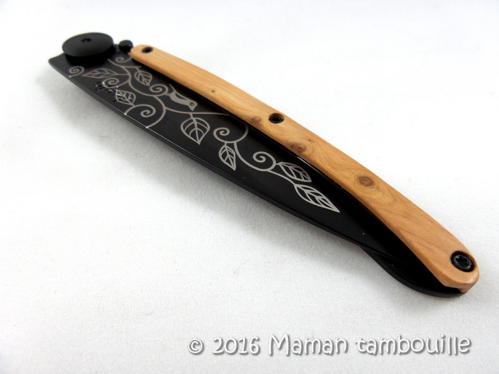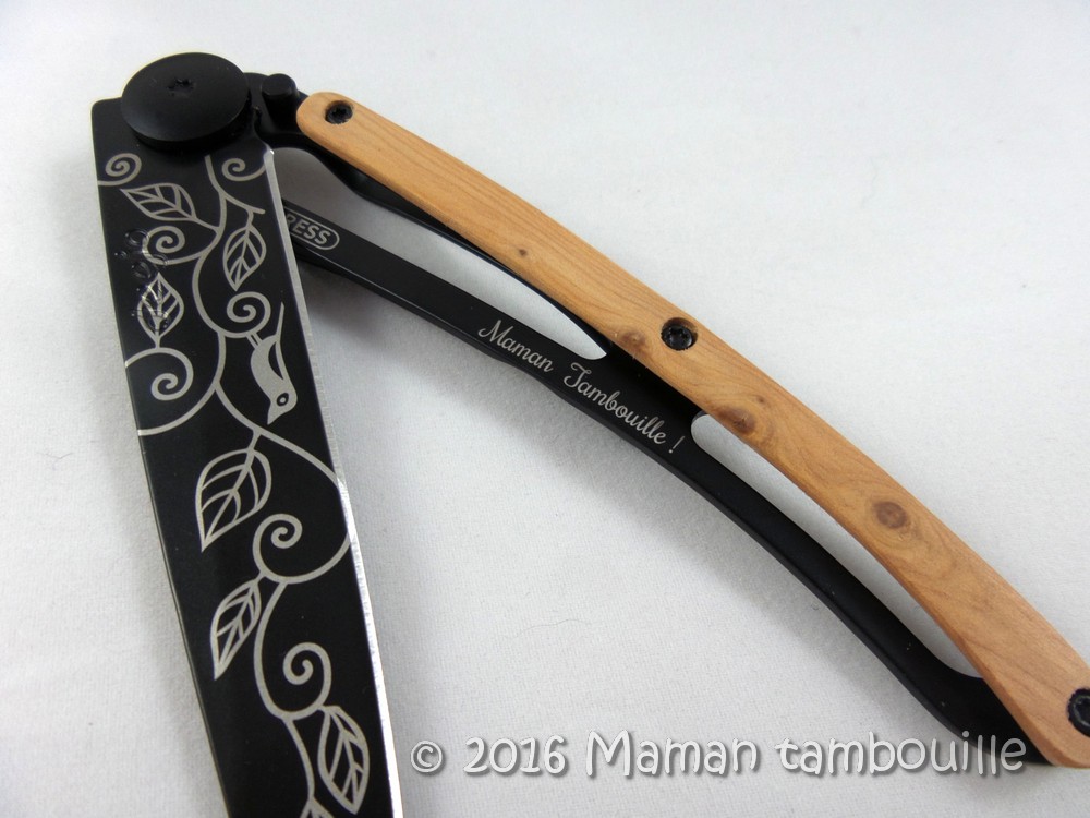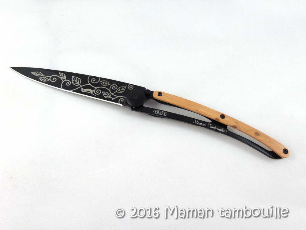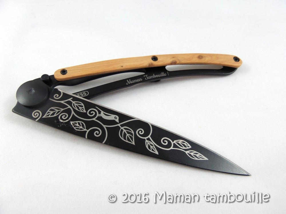Finalement, j’ai choisi la taille « standard » de 11cm, une lame noire avec un tatouage « plumage », une gravure au nom du blog, évidemment, et un manche en genévrier.