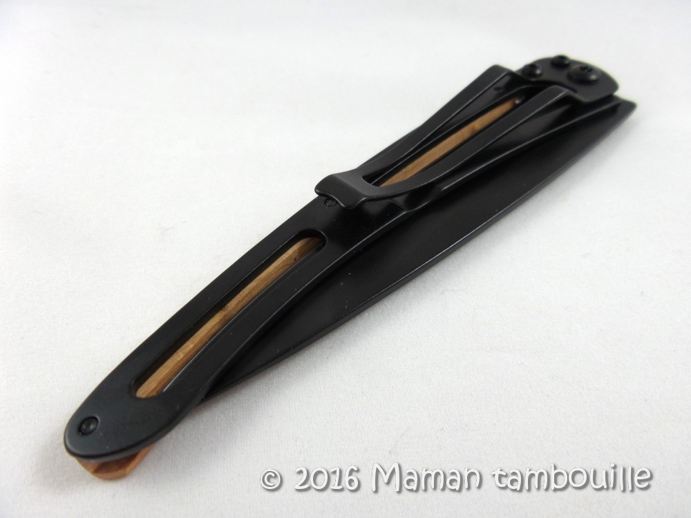 Je l’ai reçu très rapidement dans un bel écrin. Je le trouve vraiment magnifique. Le point qui m’a vraiment plu, c’est l’odeur du manche qui sent fort bon le bois ! Une fois plié, il possède un système d’accroche au dos qui permet de le faire tenir à une ceinture. Voilà l’allié parfait de vos sorties en forêt, pique nique …