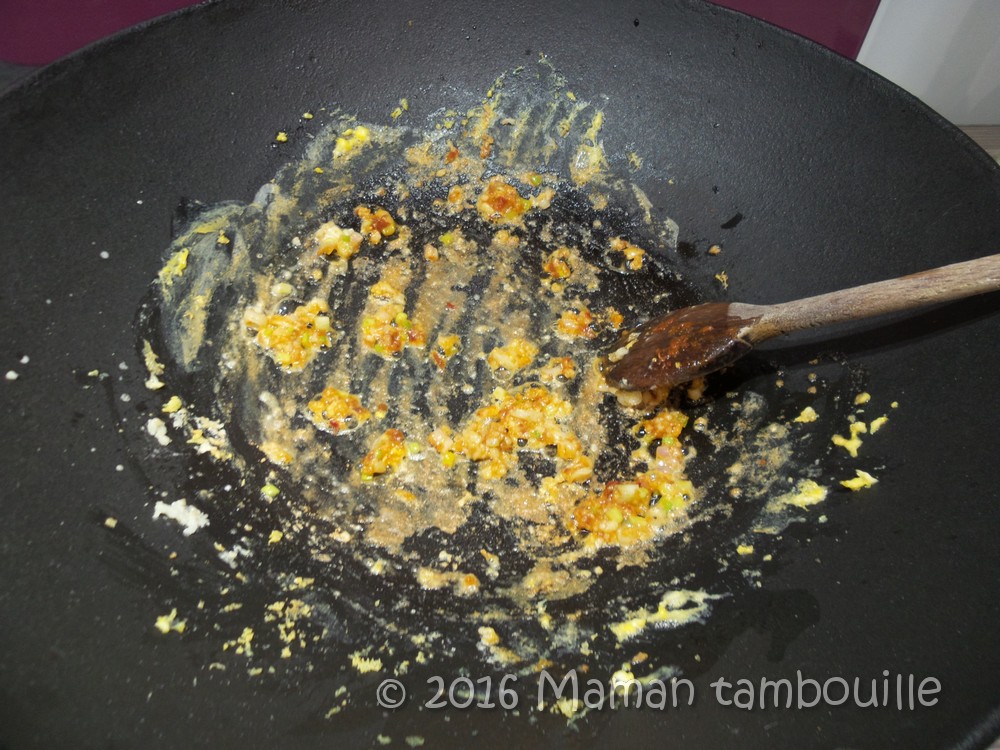 Dans un wok à feu vif, chauffer un peu d’huile puis y faire revenir les têtes de ciboules avec la pâte de curry.