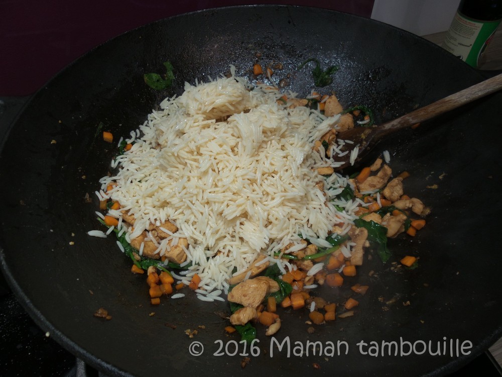 Voilà un délicieux plat thaï avec un riz bien croquant ! Depuis, j’ai toujours des sachets de riz cuit en stock 😉