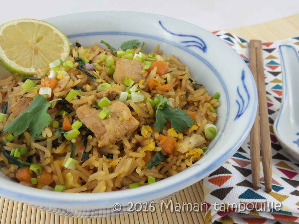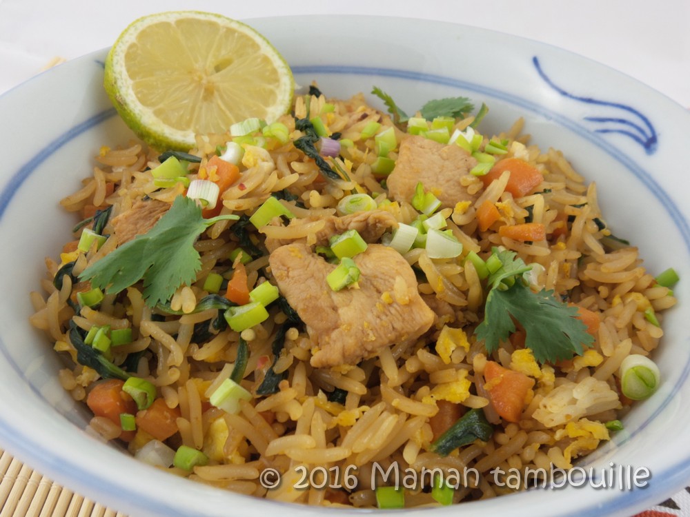 Un peu de saveurs asiatiques pour ce nasi goreng parfumé à souhait. Je suis fan de ce type de plat à base de riz thaï et là, j’ai enfin compris pourquoi j’avais toujours du mal à les réussir et à toujours me retrouver avec du riz en purée: le riz doit être cuit au minimum de la veille pour qu’il ait le temps de « sécher » un peu. J’ai toujours vu cela dans les recettes mais comme je ne prévois jamais mes repas à l’avance et bien, quand j’ai envie de ce plat, je prépare tout le jour même, y compris la cuisson du riz. Vous êtes dans mon cas ?