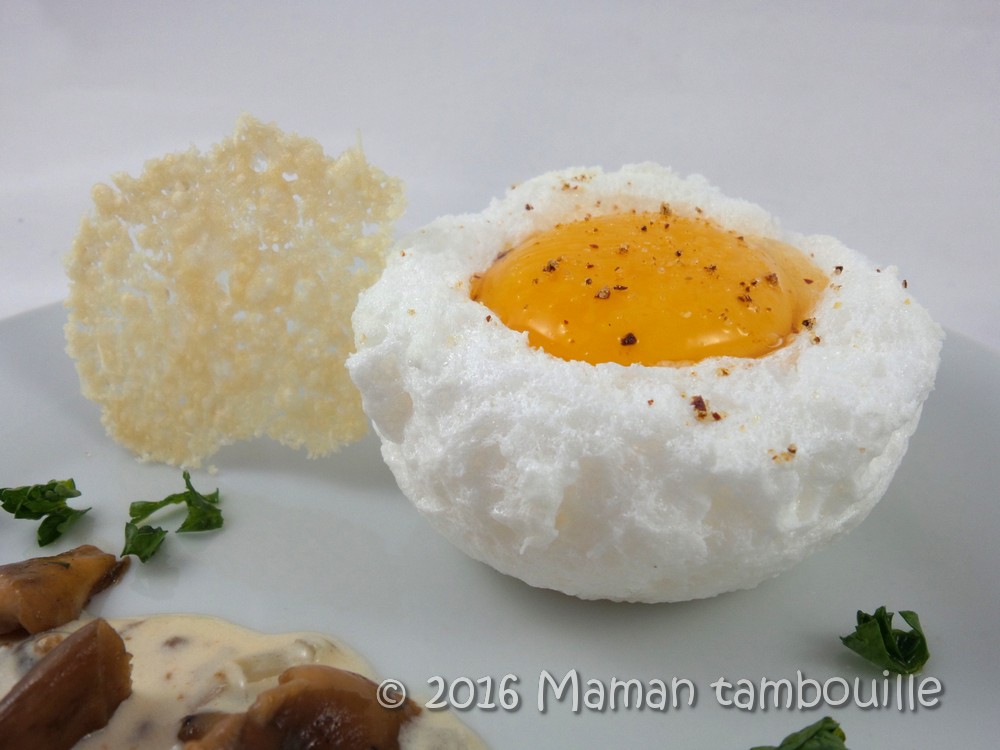 Dresser un œuf par assiette, une petite louche de sauce, quelques girolles et une tuile de parmesan.