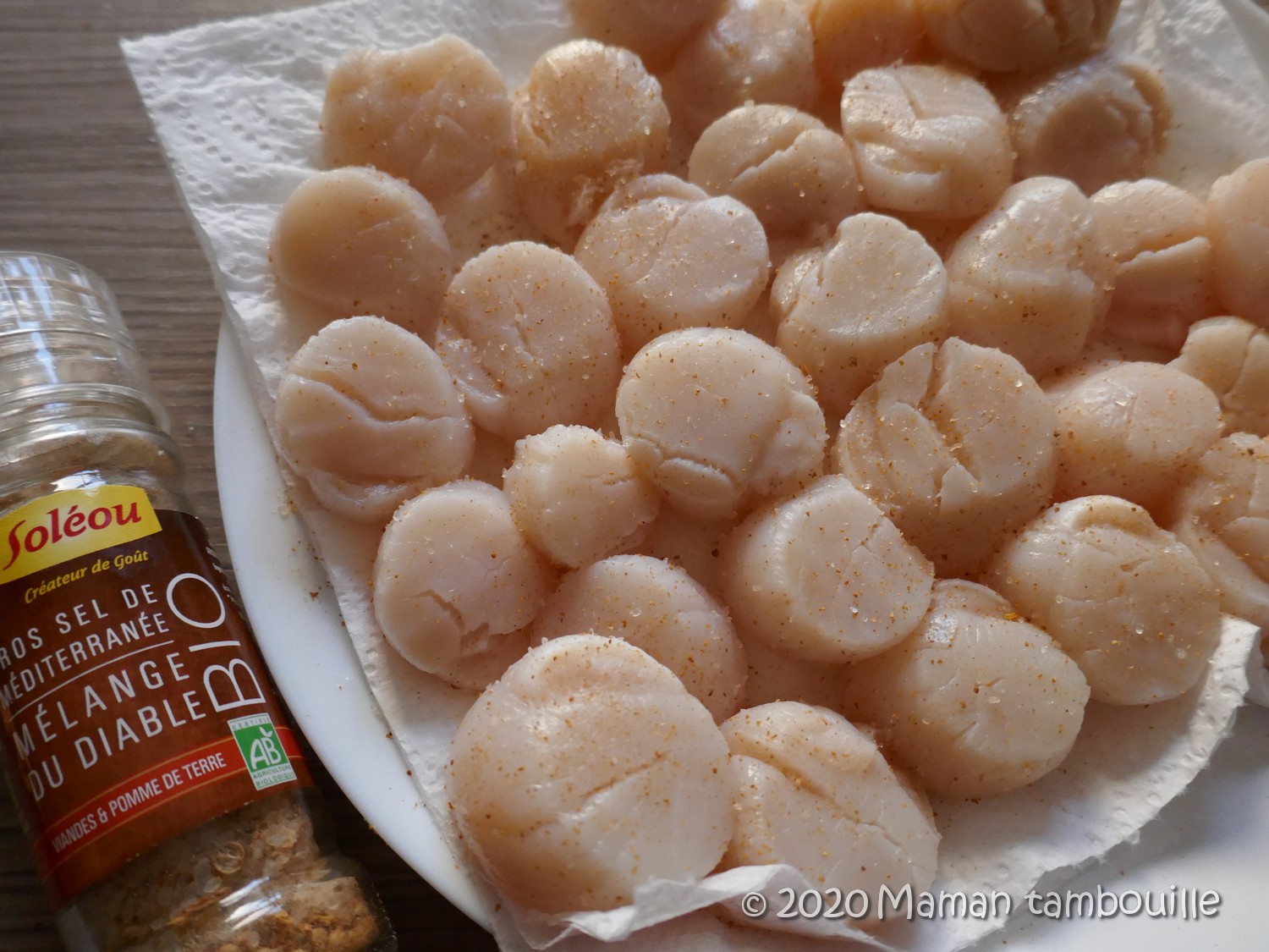 Sécher soigneusement les Saint Jacques avec de l’essuie tout puis les saler.