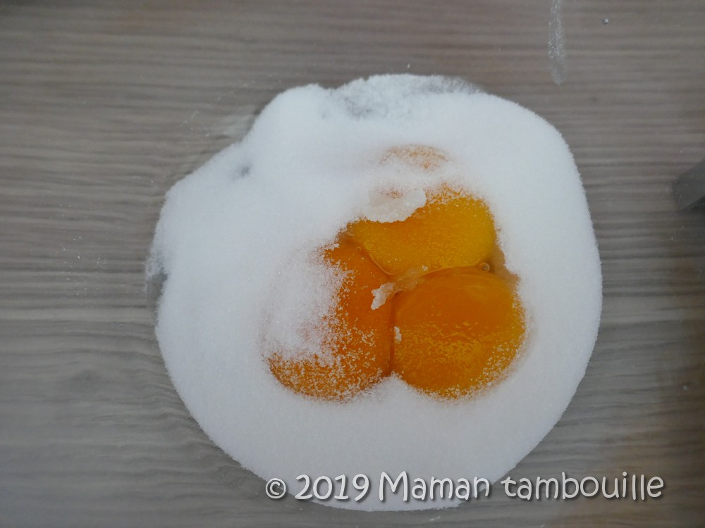 Dans un saladier, mettre les jaunes et le sucre. Fouetter pour les blanchir.