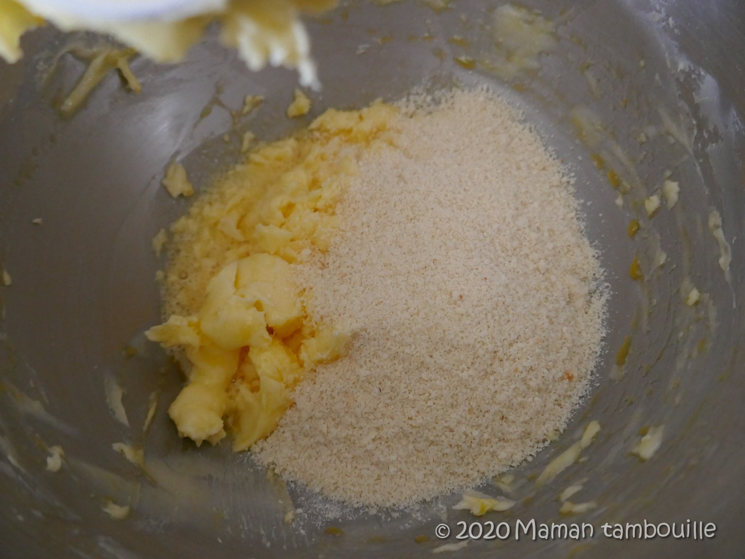 Ajouter la poudre d’amande et fouetter.