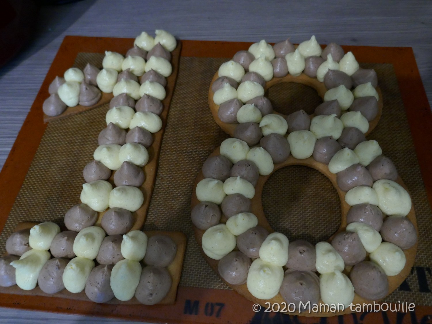 Mettre les 2 préparations dans des poches à douille avec une douille ronde moyenne (ou autre douille au choix). Pocher les crèmes harmonieusement. Poser les 2 èmes biscuits sur la crème pochée et pocher le reste de crème (j’ai eu un peu de reste des 2 crèmes. Après, cela dépend des chiffres qui vont demander plus au moins de crème et de leur taille).